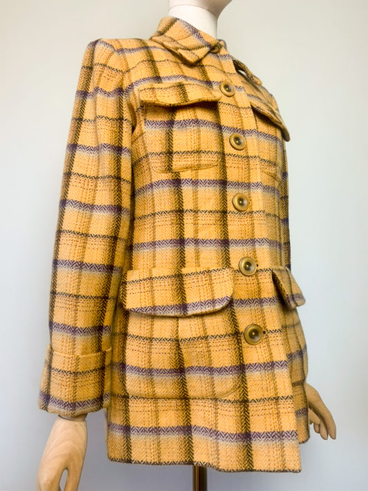 Veste-Manteau Tara Jarmon Alpine Vintage - 100% Laine Carreaux Moutarde & Violet - Fabriqué en France - T. 38