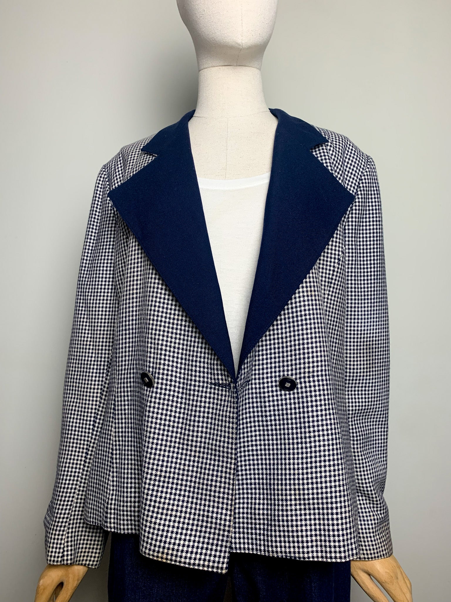 Blazer Vintage 80s Pied-de-Poule Marine/Blanc - 54% Laine - T 42 (L/XL) - Made in France