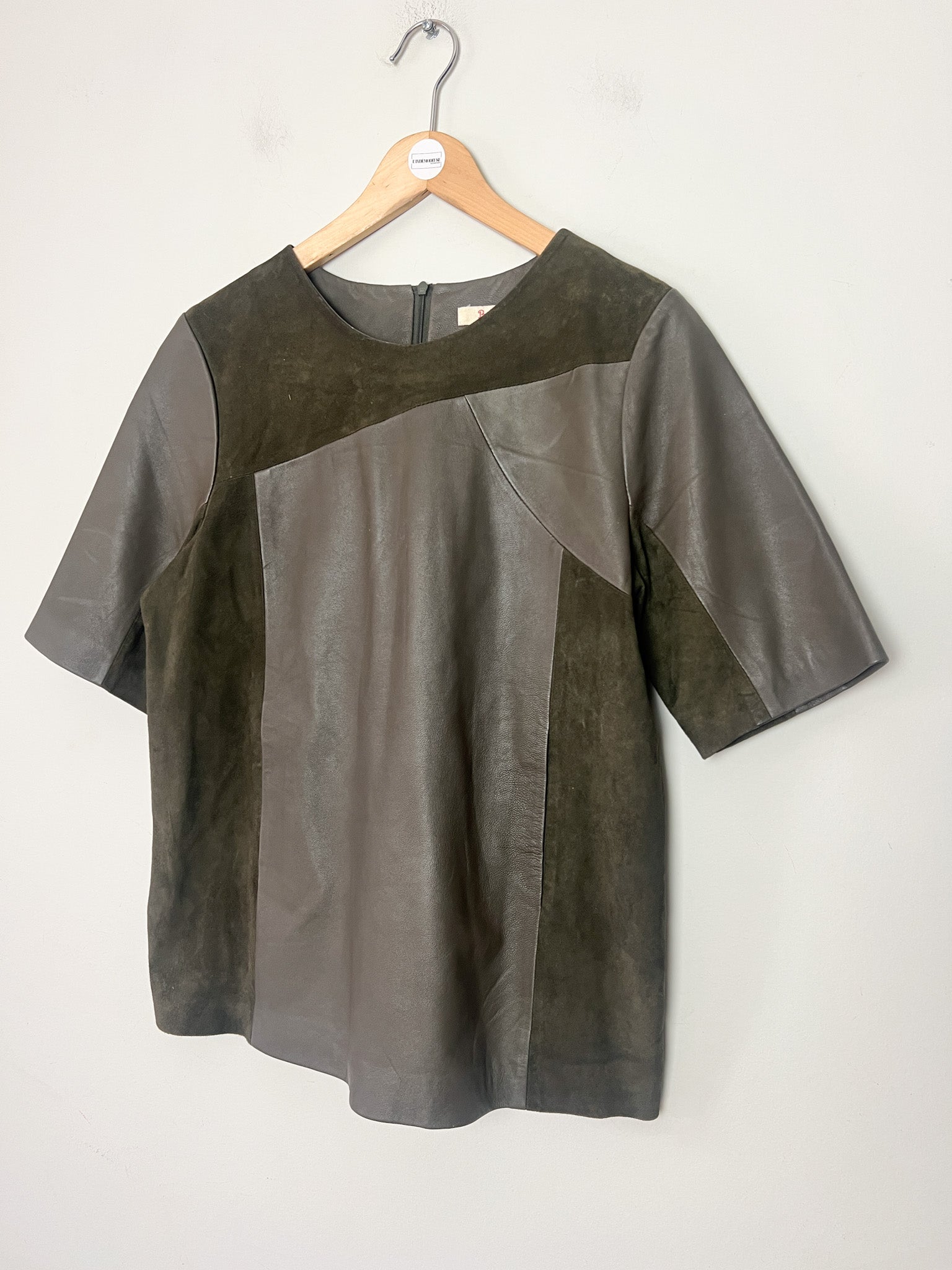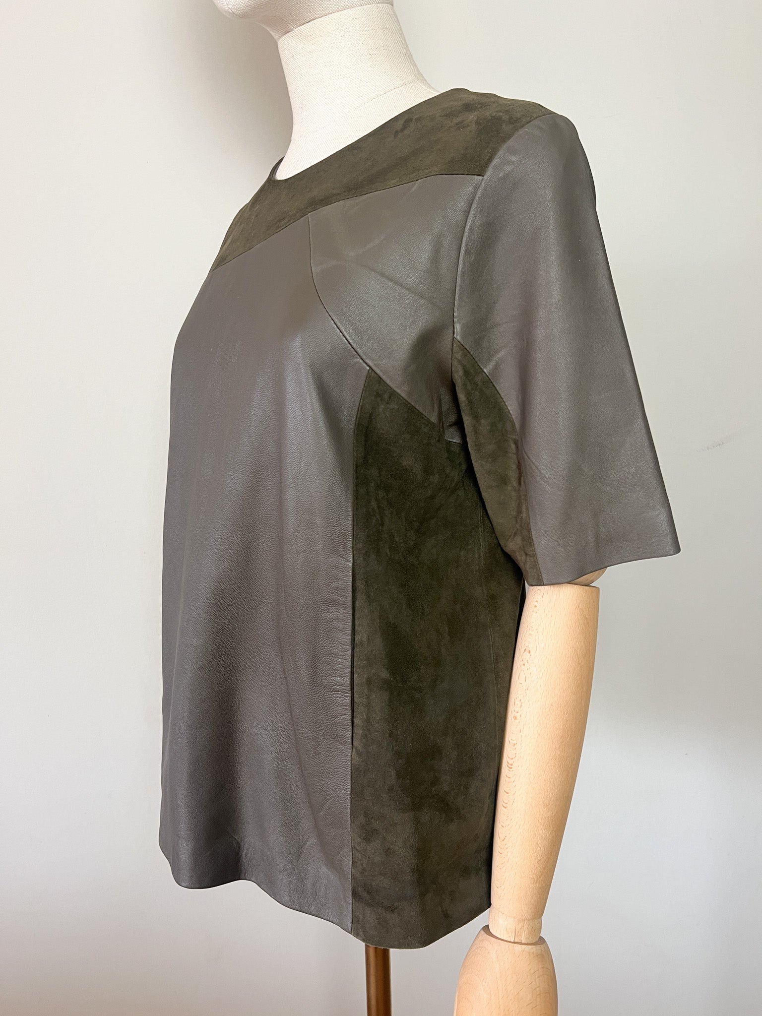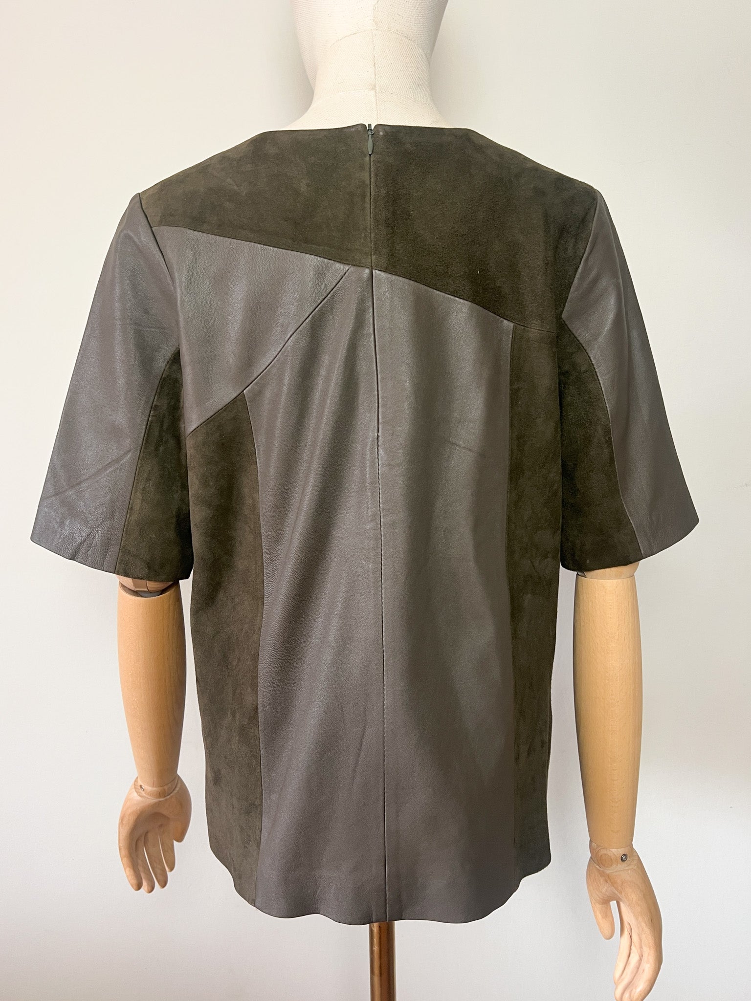 Matière Noble : Fabriqué en 100% CUIR véritable, ce top joue sur un élégant contraste de textures avec des empiècements en cuir lisse et en cuir velours (daim).