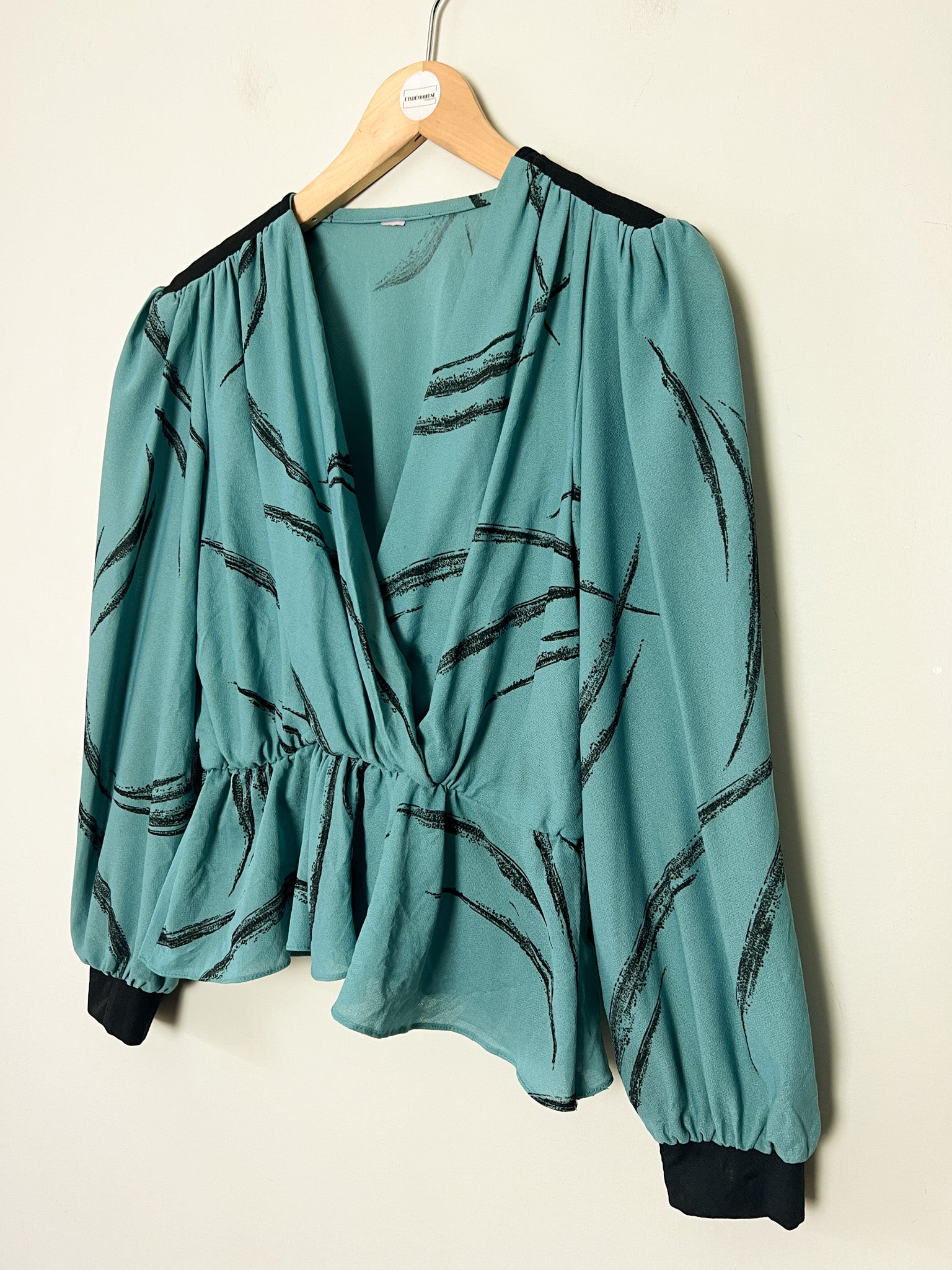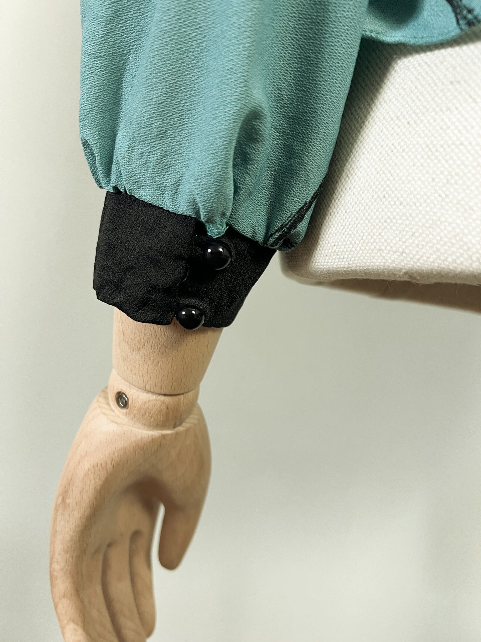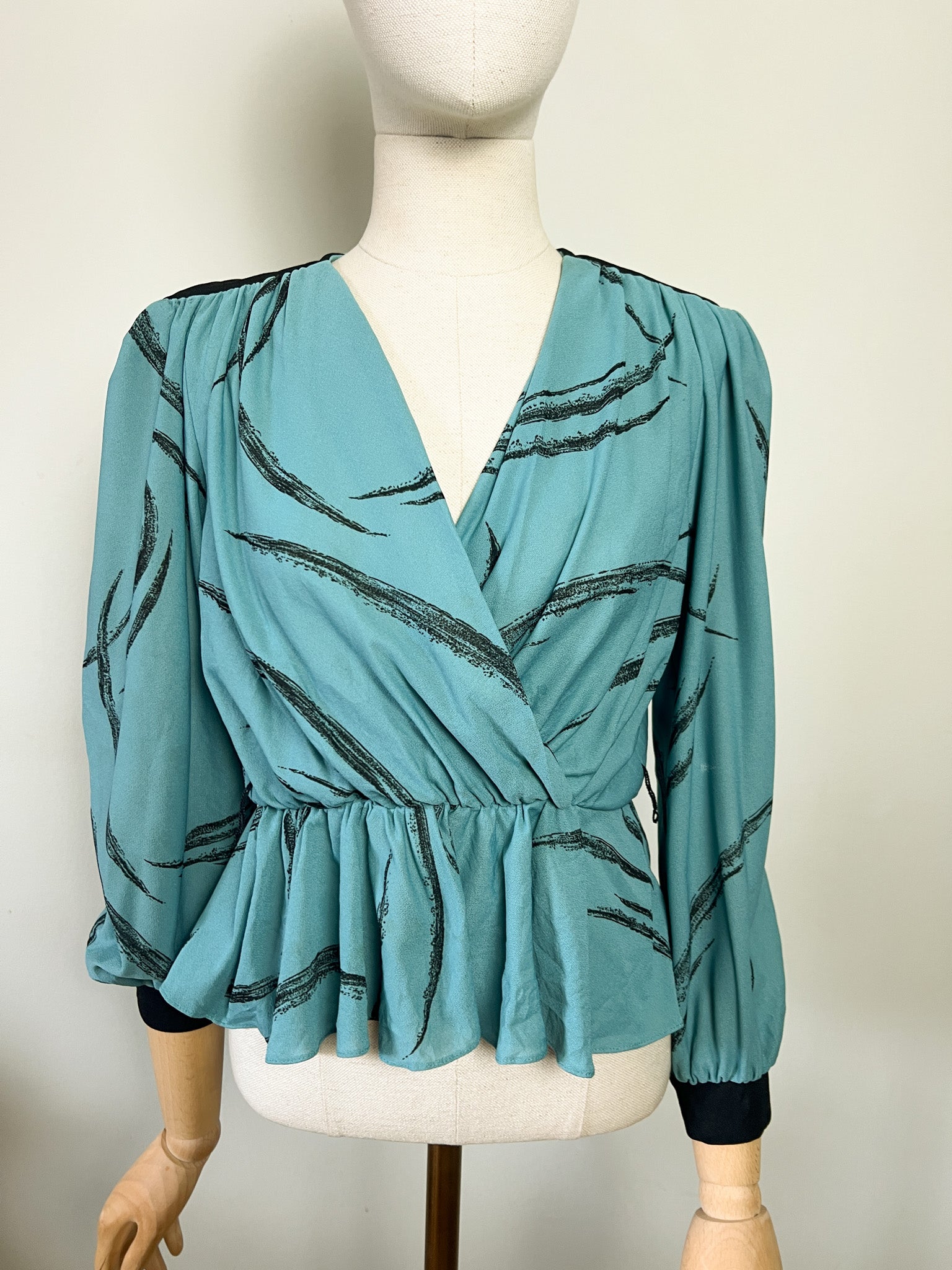 Cette blouse vintage est une pièce de caractère qui incarne le style audacieux et élégant des années 80. Sa coupe unique, avec un décolleté croisé et une basque élastique, met en valeur la silhouette tout en restant confortable. Le tissu, dans un coloris bleu-vert profond, est orné d'un subtil motif noir qui ajoute de la texture et du relief.