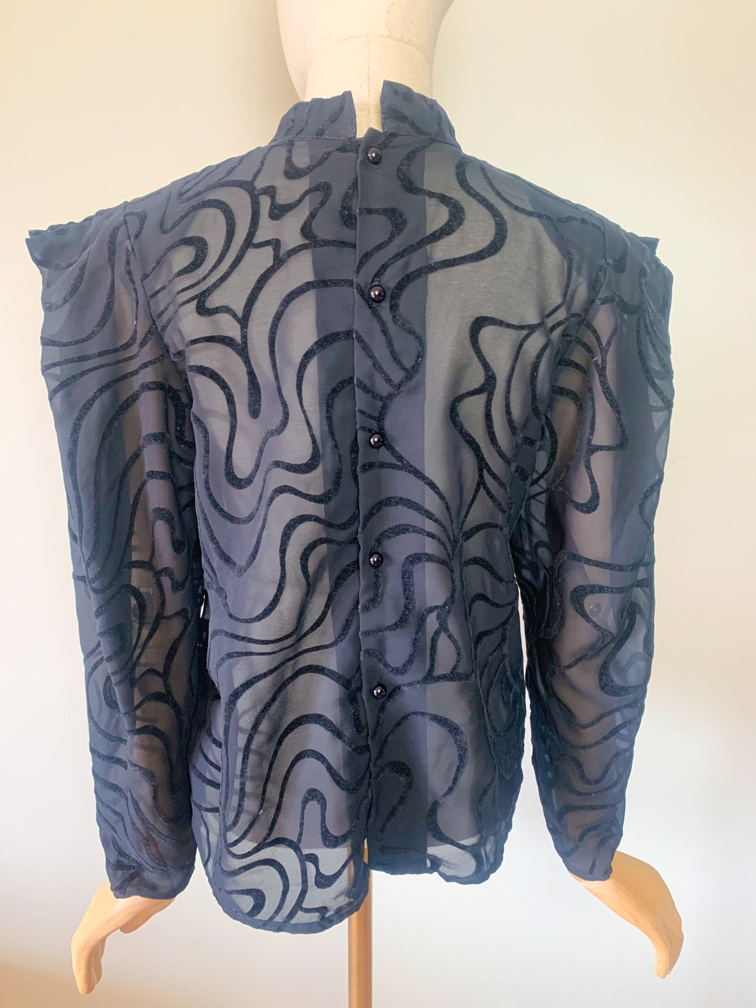 Confectionnée dans un délicat voile noir transparent, la blouse est sublimée par un somptueux motif velours floqué aux lignes ondulées, créant un jeu de texture et de transparence fascinant. Sa coupe droite, légèrement ample, est structurée par des épaulettes intégrées, typiques de cette époque. Elle dispose d'un col montant et d'une élégante fermeture boutonnée au dos.