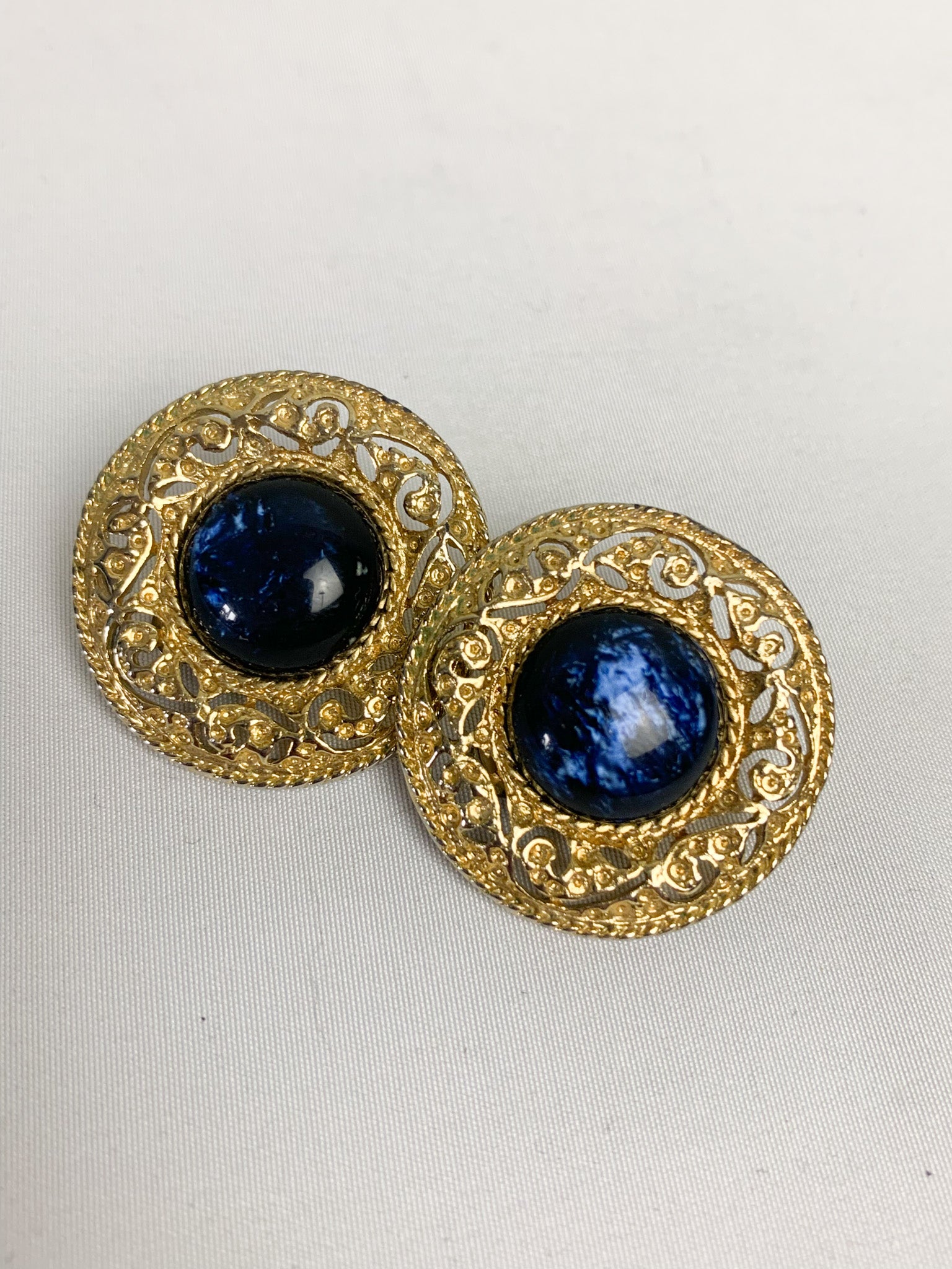Boucles d'Oreilles Clips Vintage Rondes Ciselées - Pierre Cabochon Bleu Marbré & Doré - Années 80 - Rétro Luxe