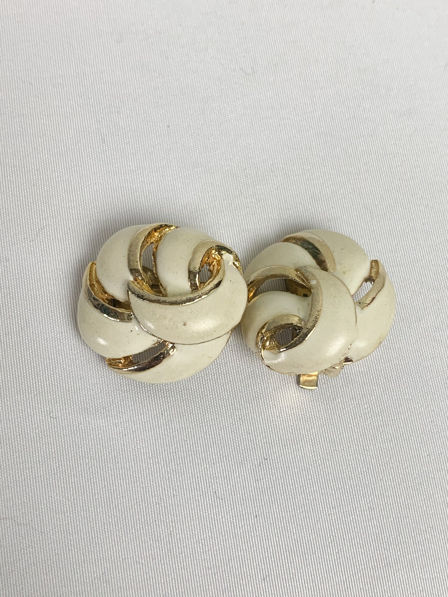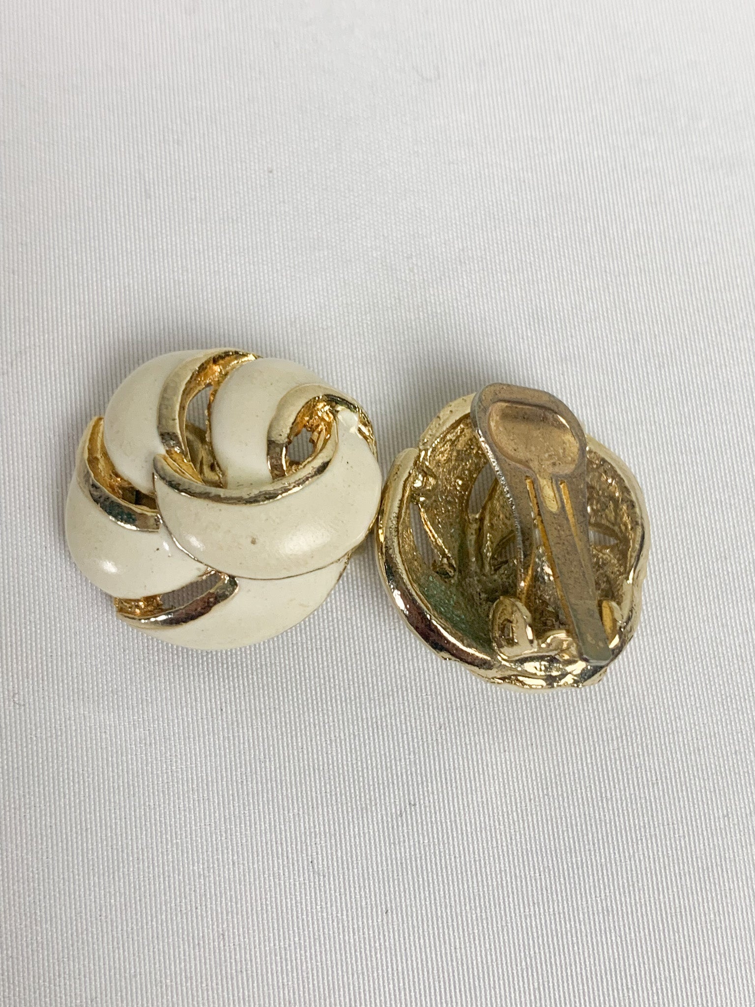 Découvrez ces superbes boucles d'oreilles clips vintage, un bijou au charme intemporel. Leur design en rosace, associant l'émail crème et le métal doré, en fait une pièce d'exception pour un style rétro sophistiqué.
