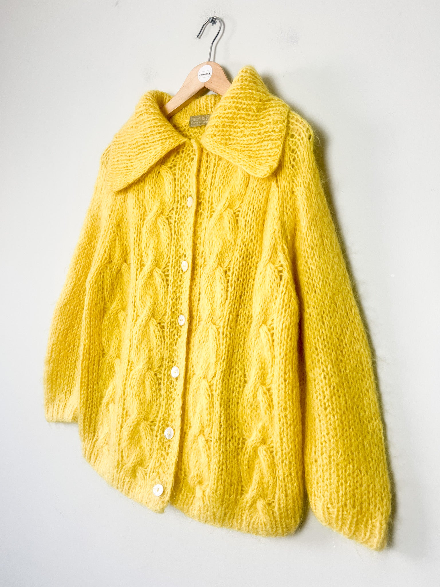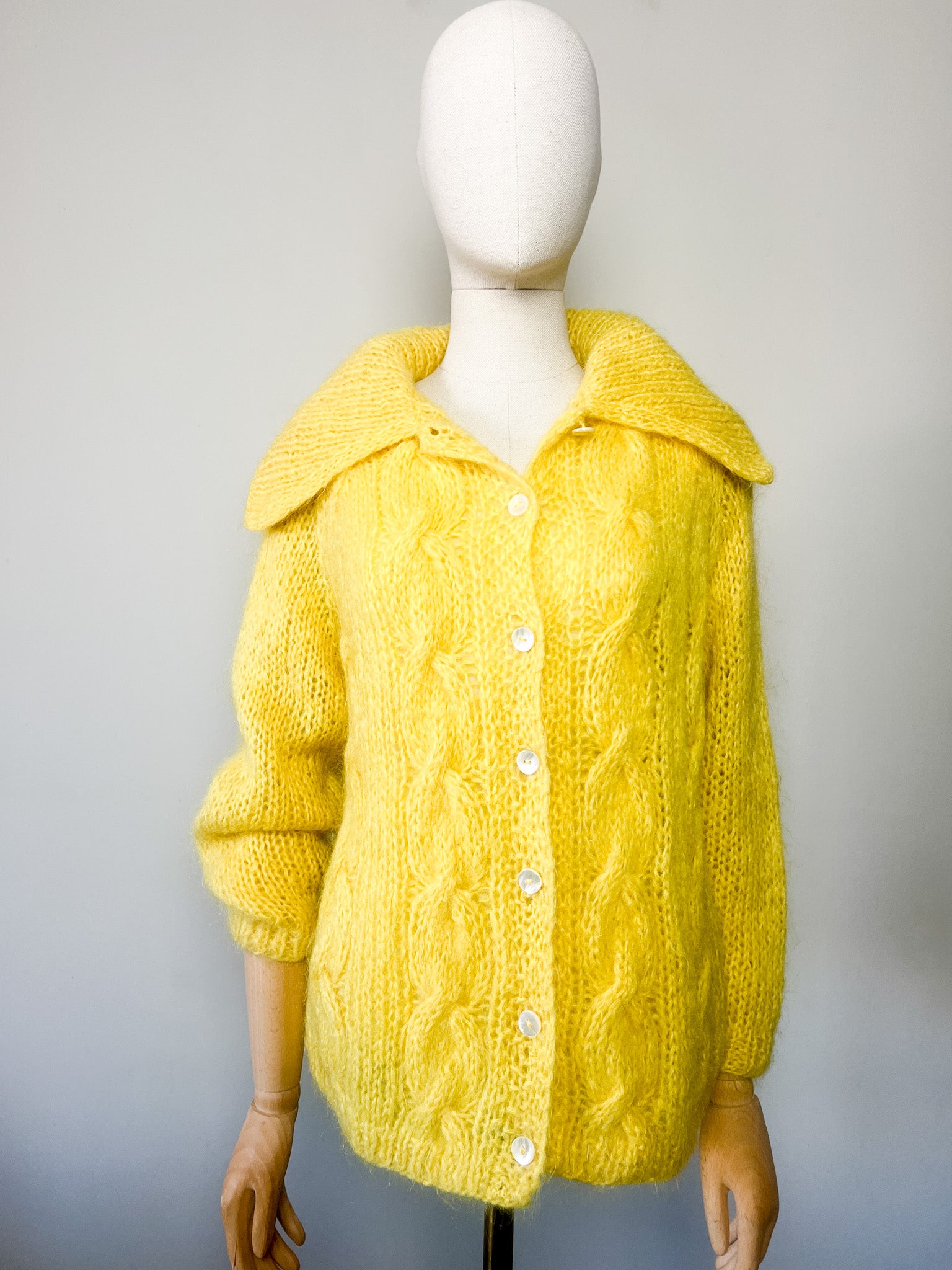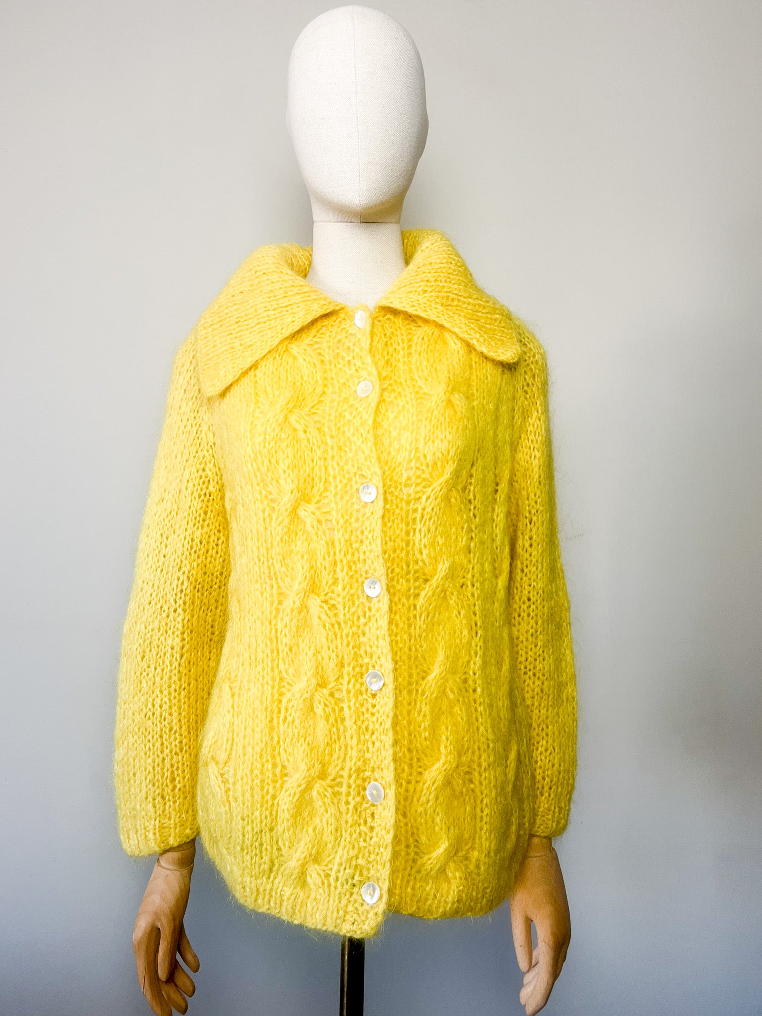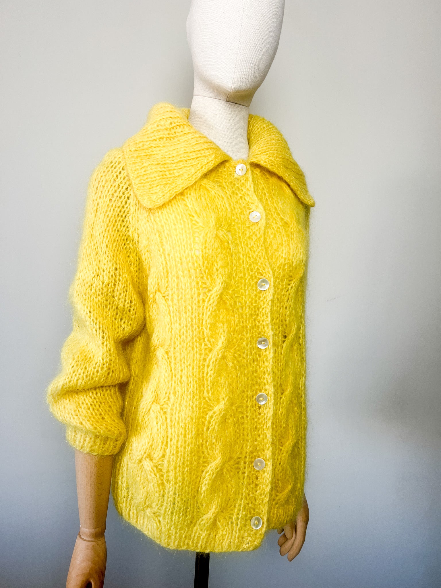 Cardigan Vintage Laine & 60% Mohair - Tricoté Main Torsades - Jaune Soleil - T. M/L