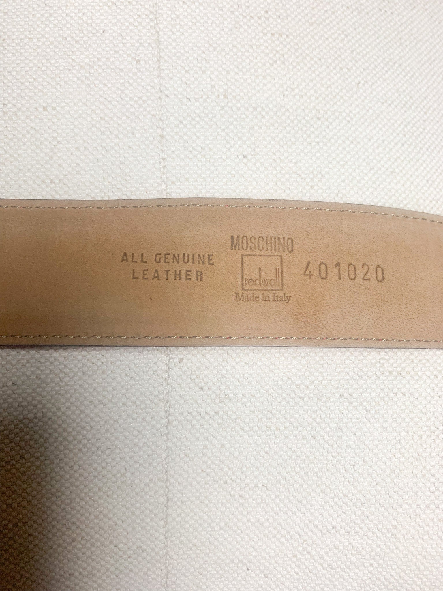 Fermeture Réglable Innovante : Dotée de "champignons" dorés pour ajuster la longueur, elle allie fonctionnalité et esthétisme unique, une caractéristique appréciée des ceintures Moschino de l'époque.