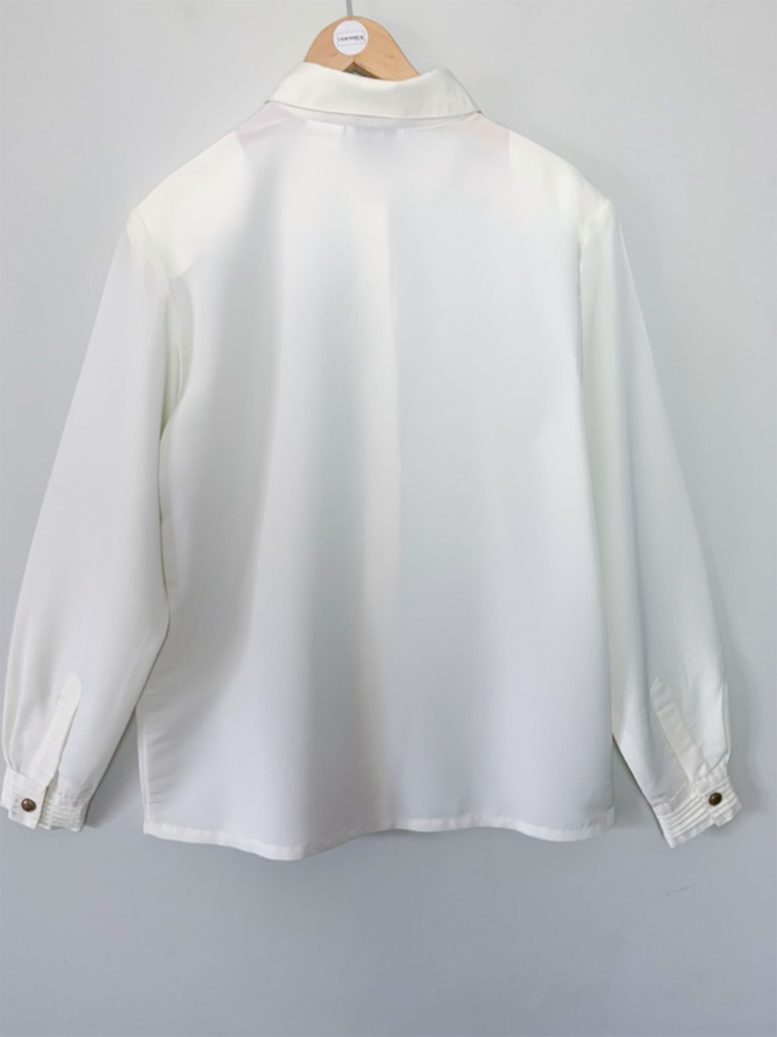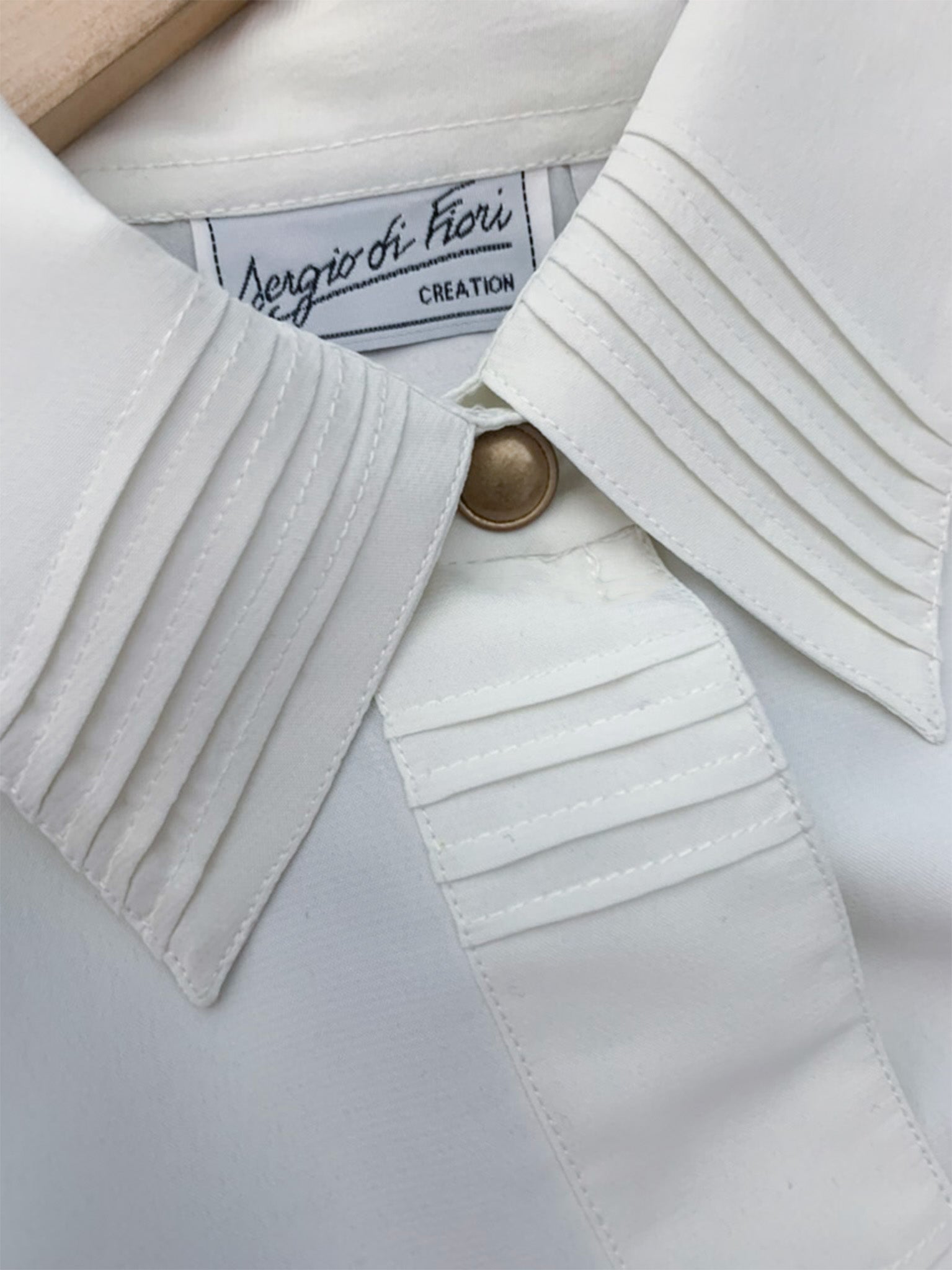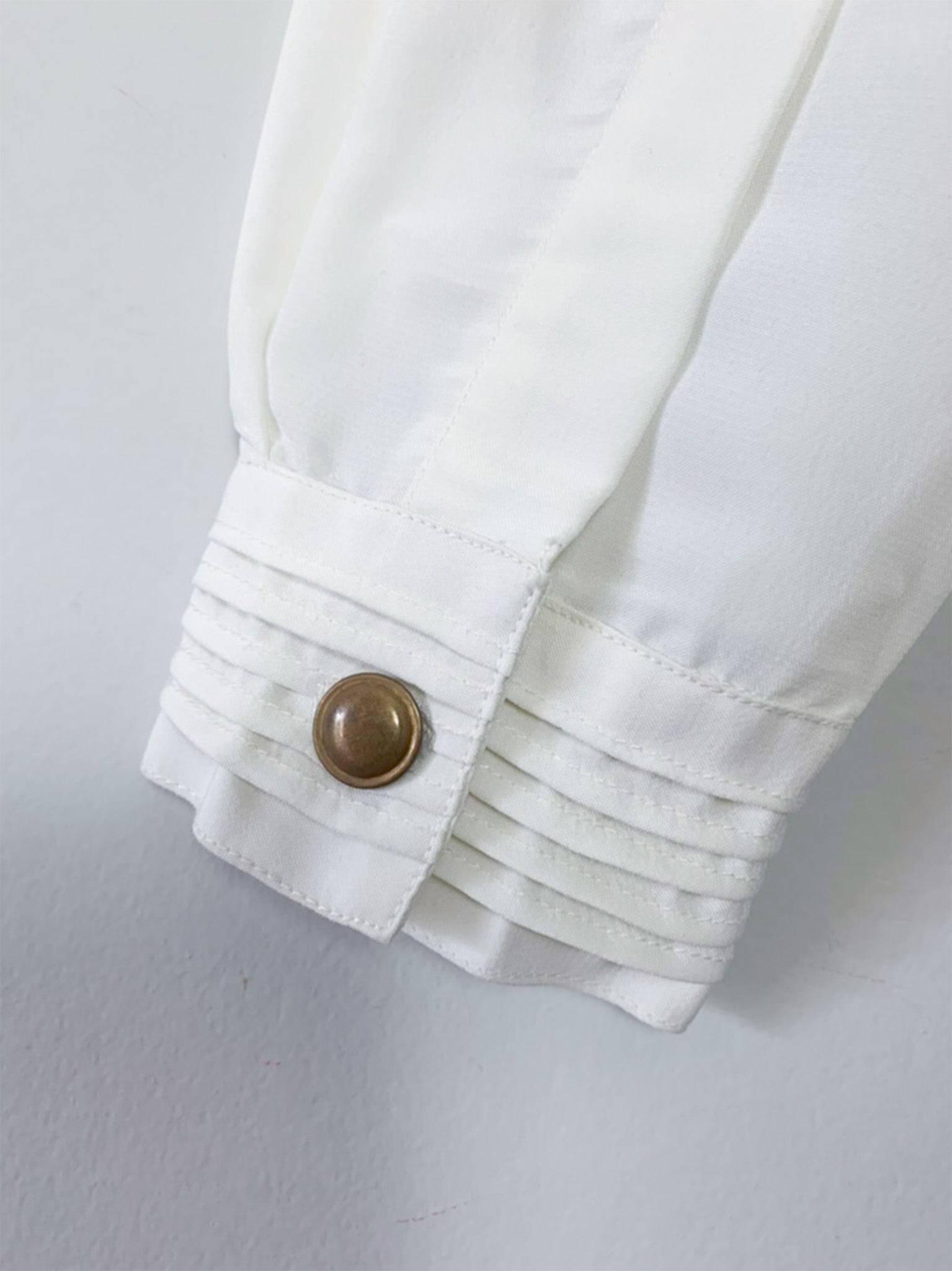 Caractéristiques : Des détails de plis ornent le col, le centre de la pièce et les poignets. La patte de boutonnage est cachée, à l'exception du premier bouton visible, qui est de couleur bronze, ajoutant une touche délicate.