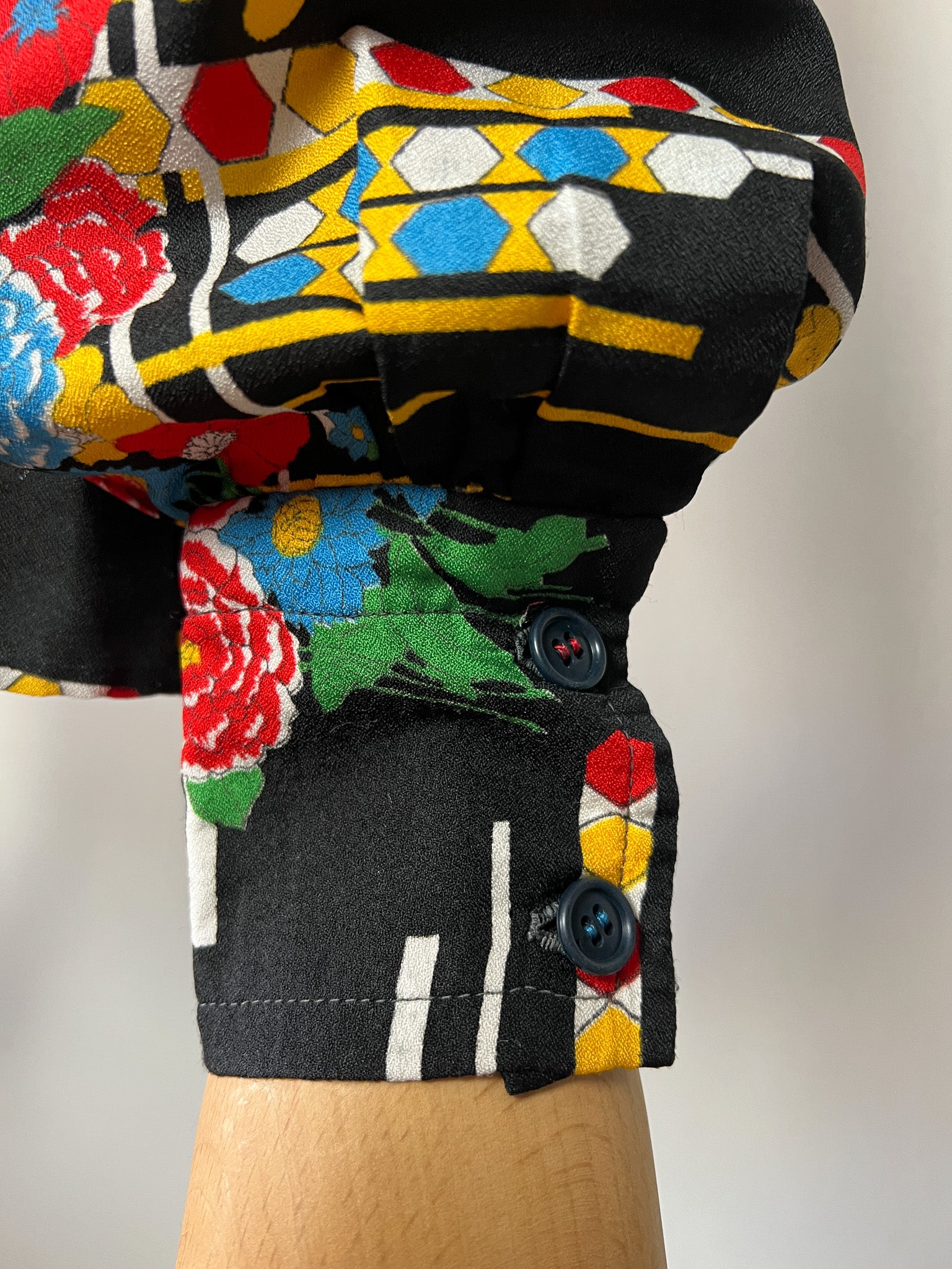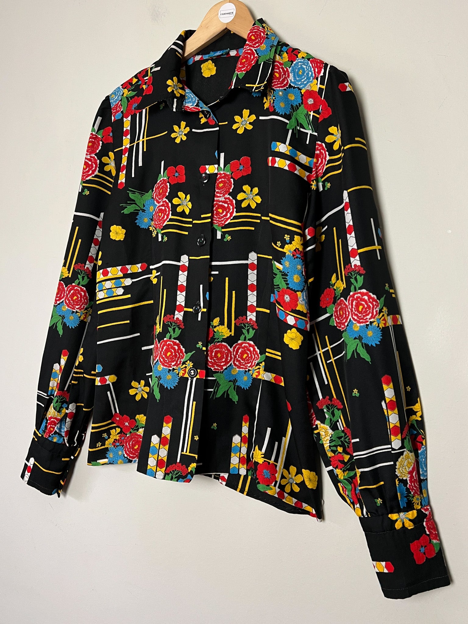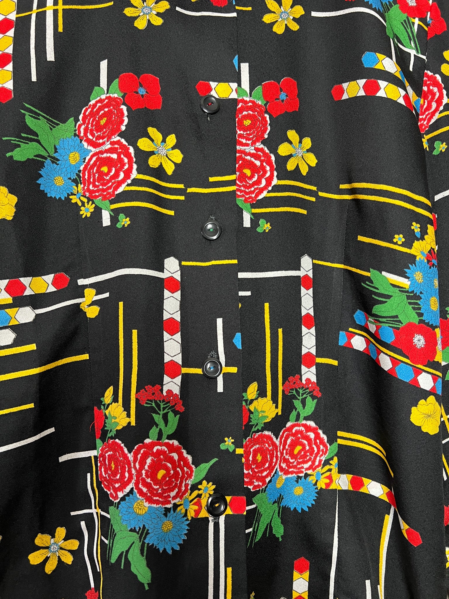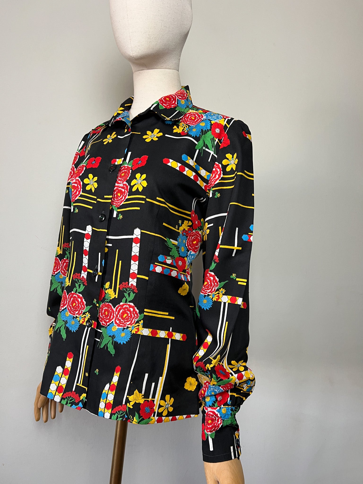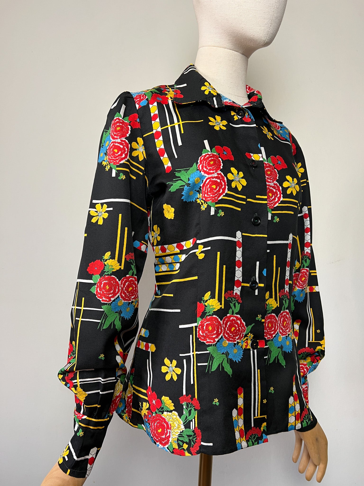 Chemisier Vintage Noir Imprimé Graphique Vif - Style 80s/90s Pop Art - Boutons Fantaisie - Taille 38 FR