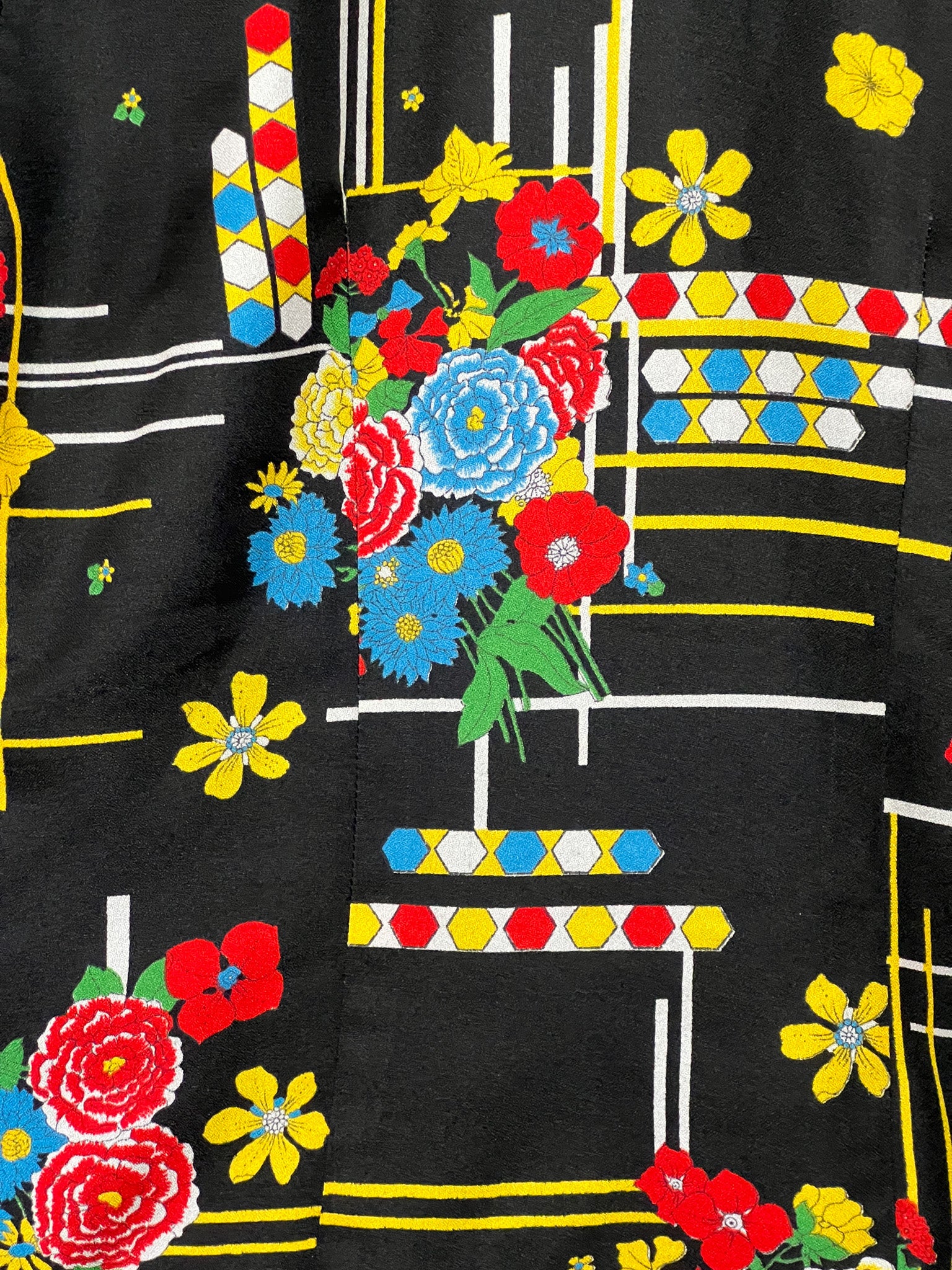 Design Expressif : Imprimé riche et coloré, mêlant des motifs floraux et des lignes graphiques sur fond noir.