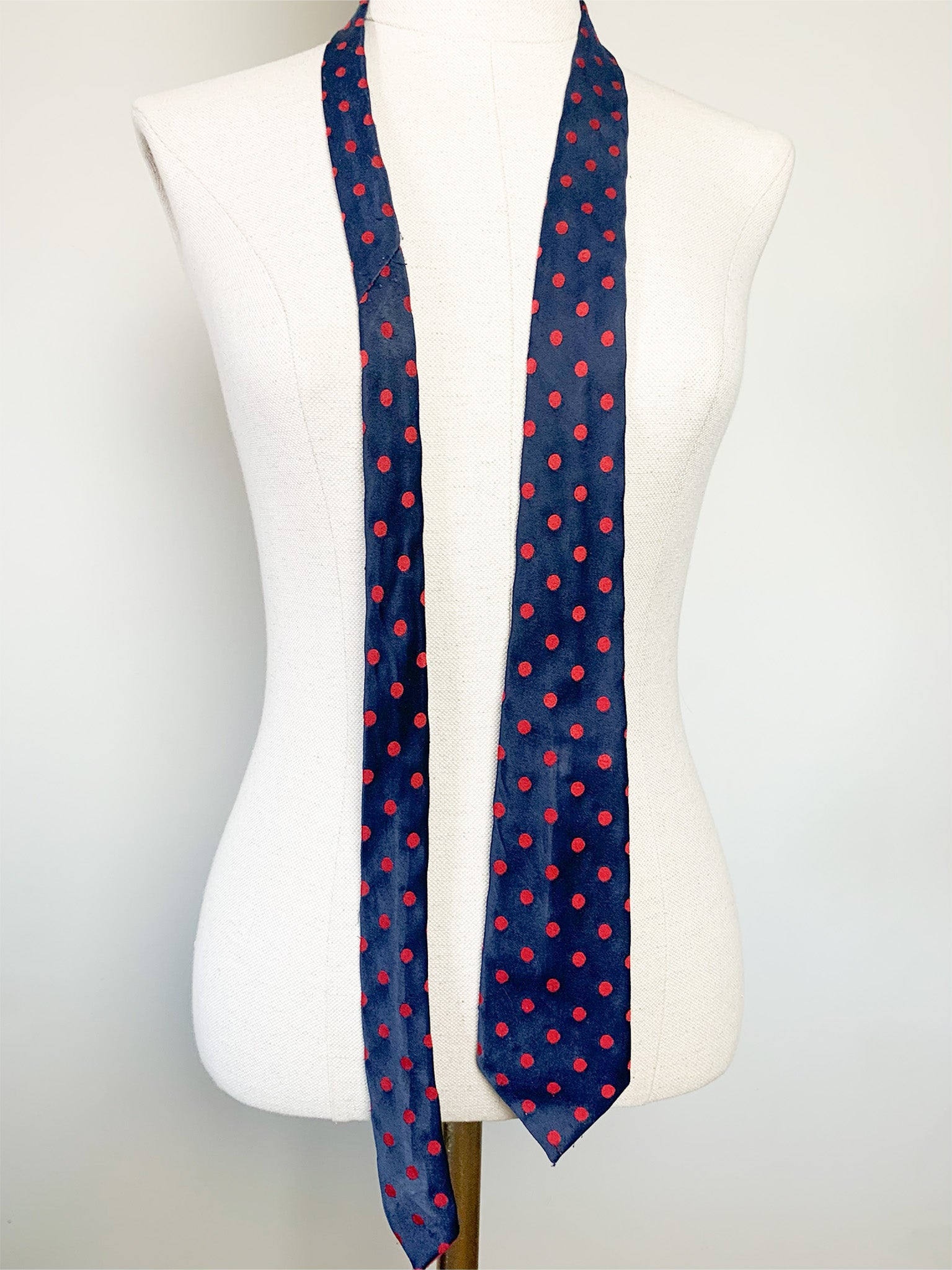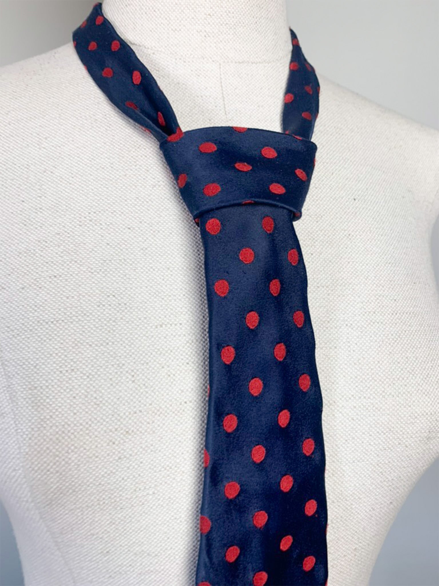 Cravate vintage parfaite pour ajouter une note classique et distinguée. Son motif Pois Rouges sur fond Bleu Marine est un incontournable de la garde-robe masculine et unisexe.