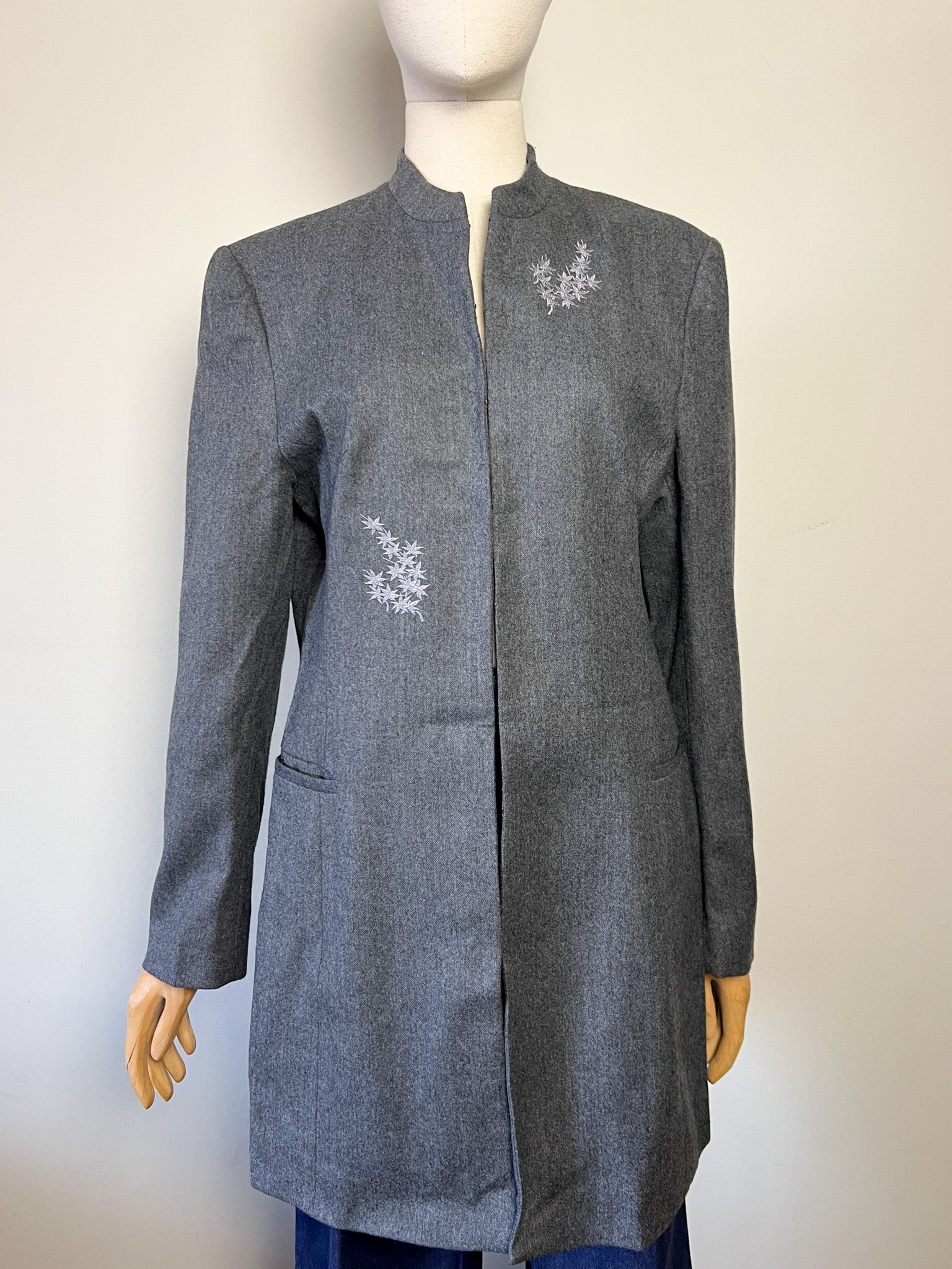 Son design intemporel se distingue par une coupe droite flatteuse, un petit col montant sophistiqué et des épaulettes subtiles qui structurent la silhouette. Le coloris gris chiné classique est magnifié par des broderies florales stylisées en ton sur ton sur le devant et les manches, ajoutant une touche d'originalité et de finesse. Doté de poches plates discrètes et d'une fermeture par agrafes, ce manteau est entièrement doublé en 100% acétate pour un confort optimal.