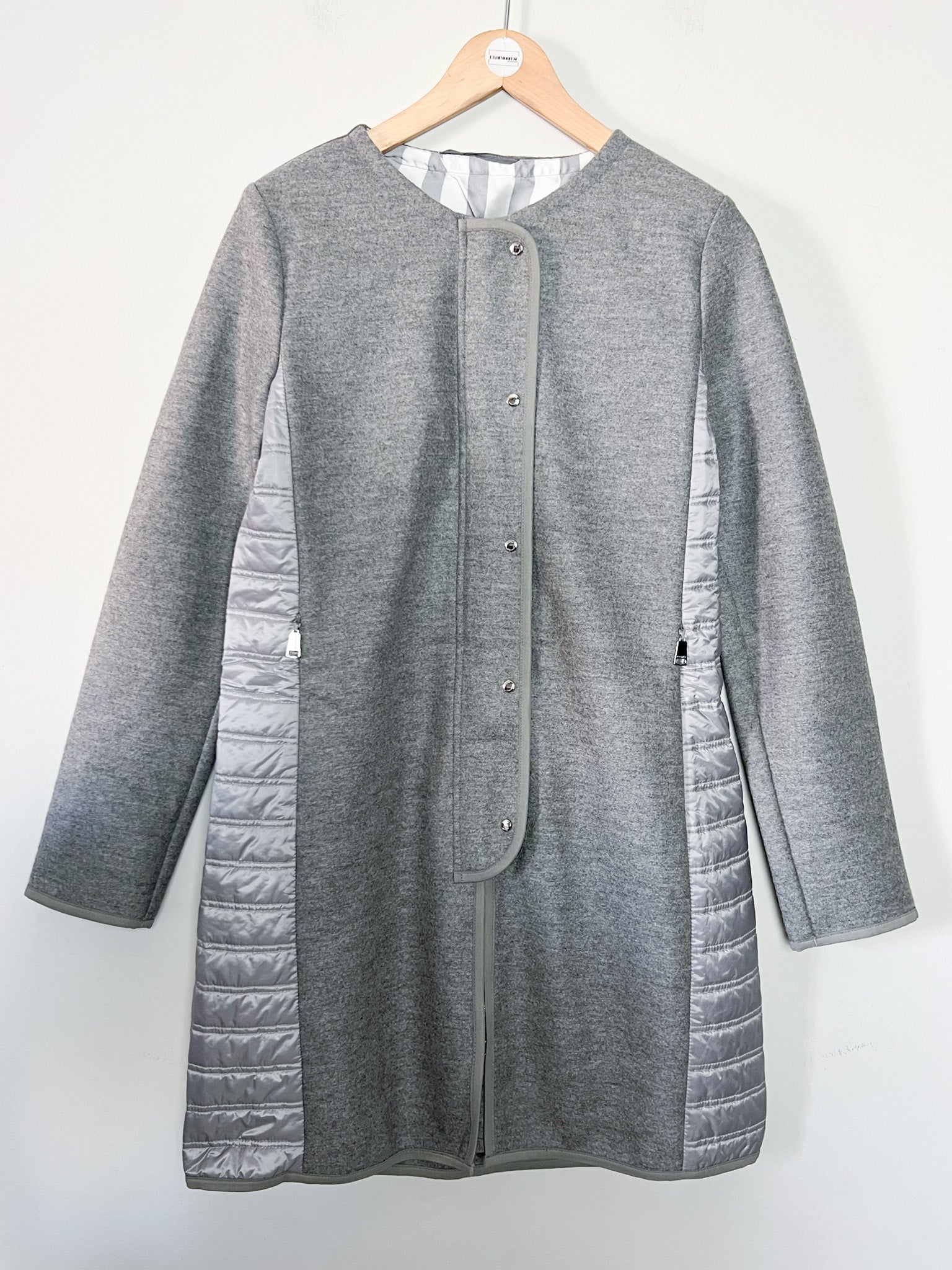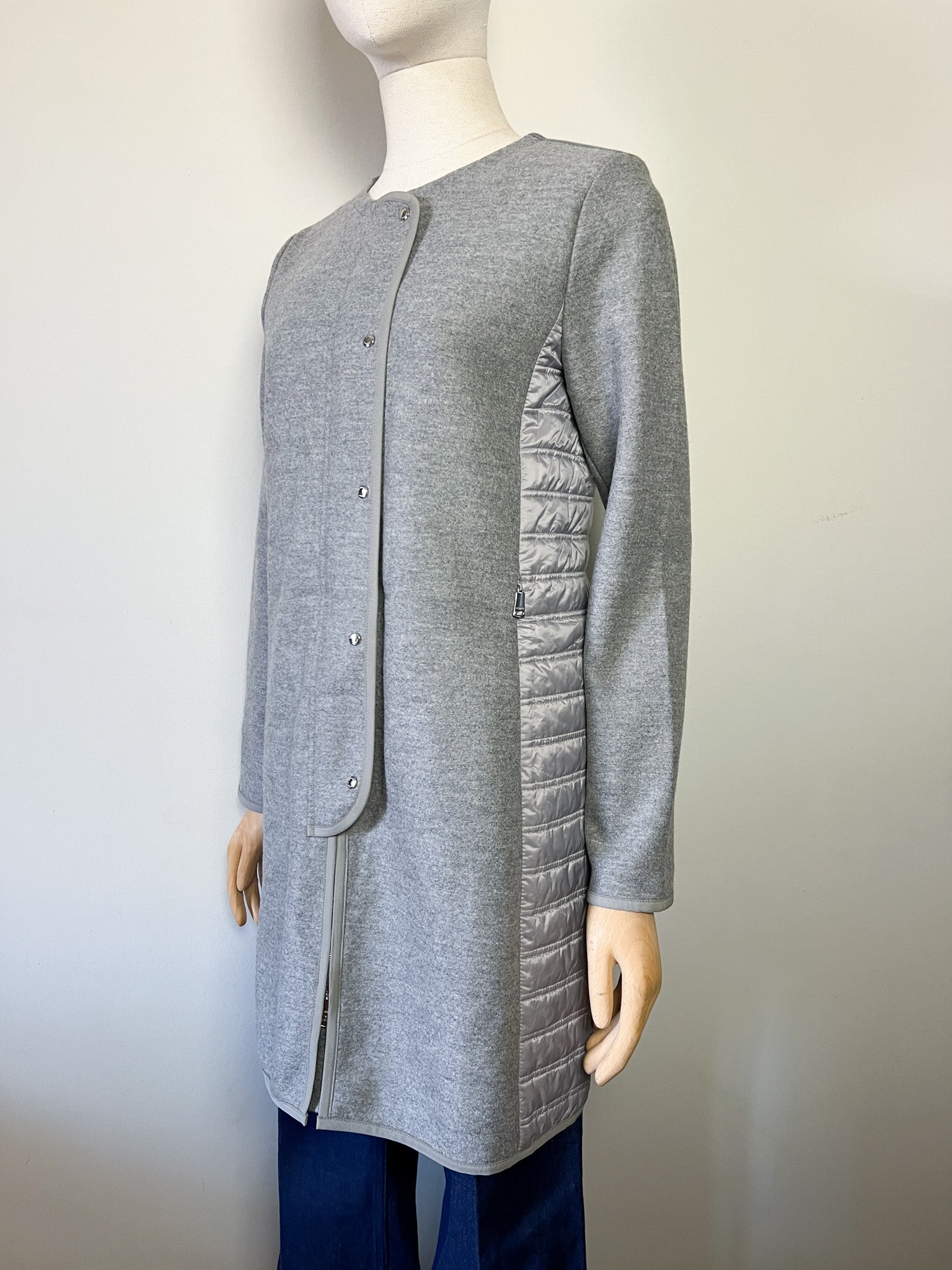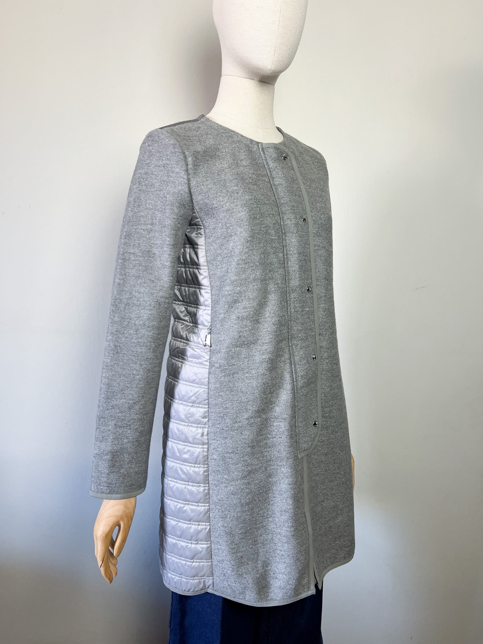 Ce manteau se distingue par son design bi-matière sophistiqué : le corps est confectionné en 100 % pure laine vierge d'un élégant gris chiné clair, offrant chaleur et douceur. Les empiècements latéraux et la doublure sont en polyamide matelassé gris argenté, garantissant légèreté et protection contre les éléments.