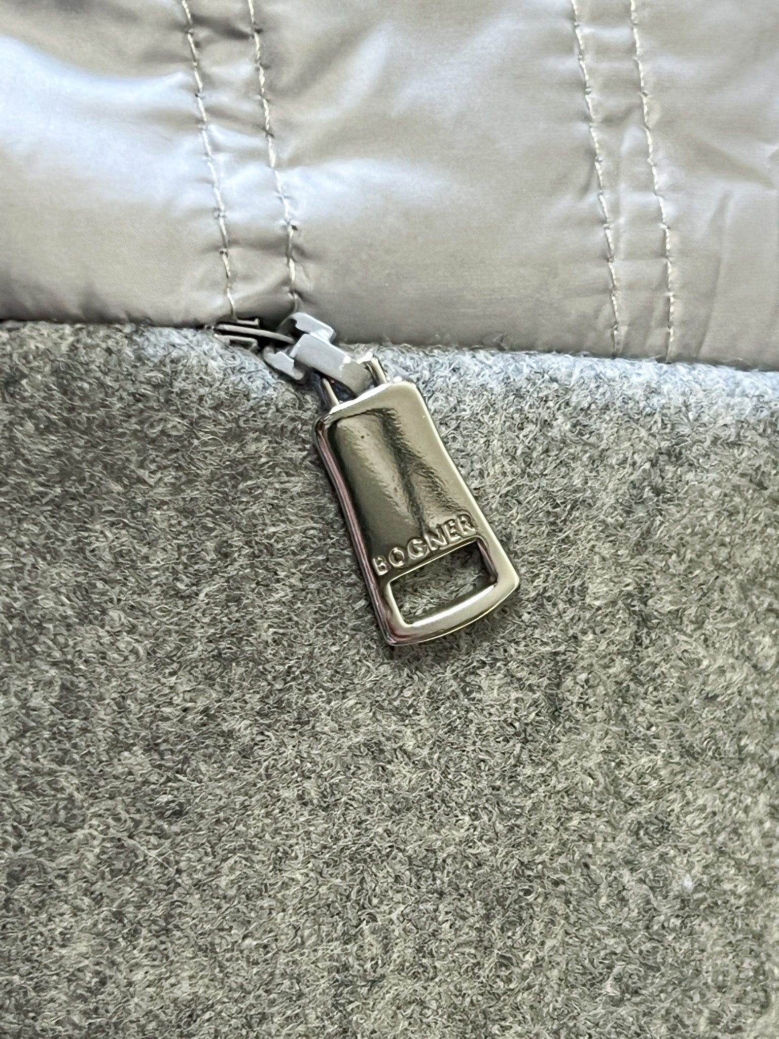 Sa coupe droite légèrement évasée, son col rond épuré et sa double fermeture (zip invisible sous patte de boutons pressions métalliques siglés Bogner) créent une silhouette moderne et fonctionnelle. Des poches latérales zippées, également ornées de tirettes siglées Bogner, ajoutent une touche pratique.