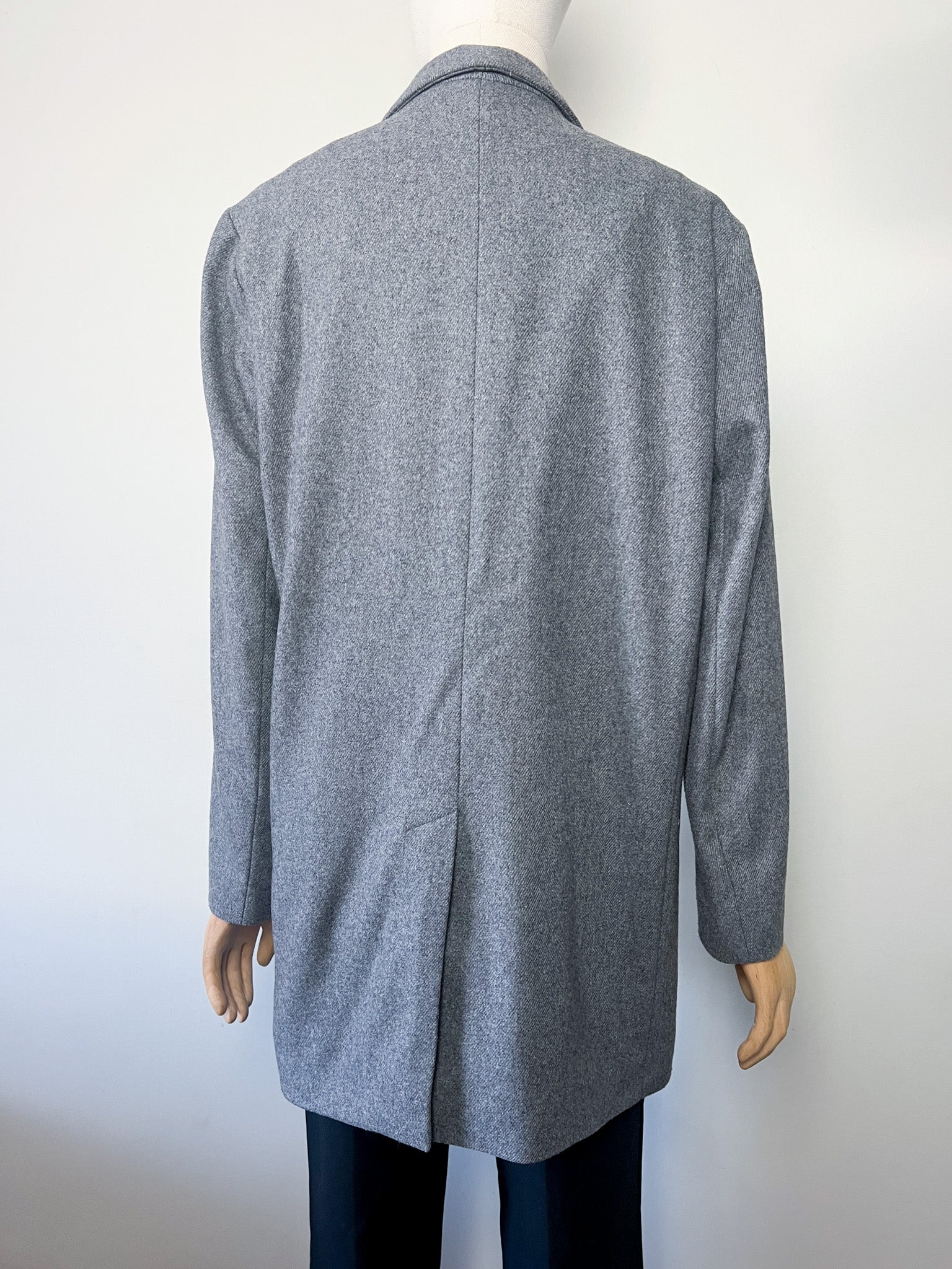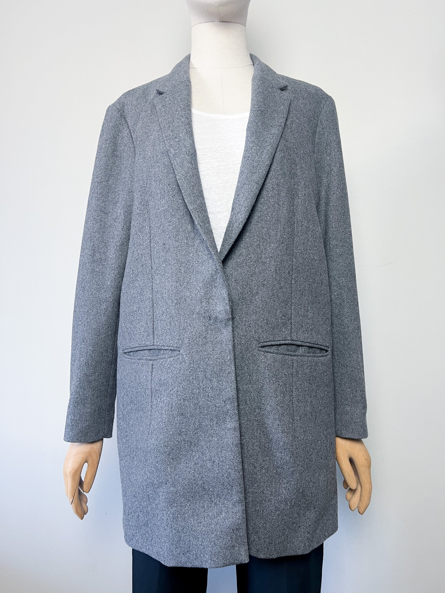 Finition Épurée : Col tailleur classique, poches passepoilées plates, et fermeture discrète par un unique bouton-pression. L'absence de boutons visibles renforce le look épuré et moderne.
