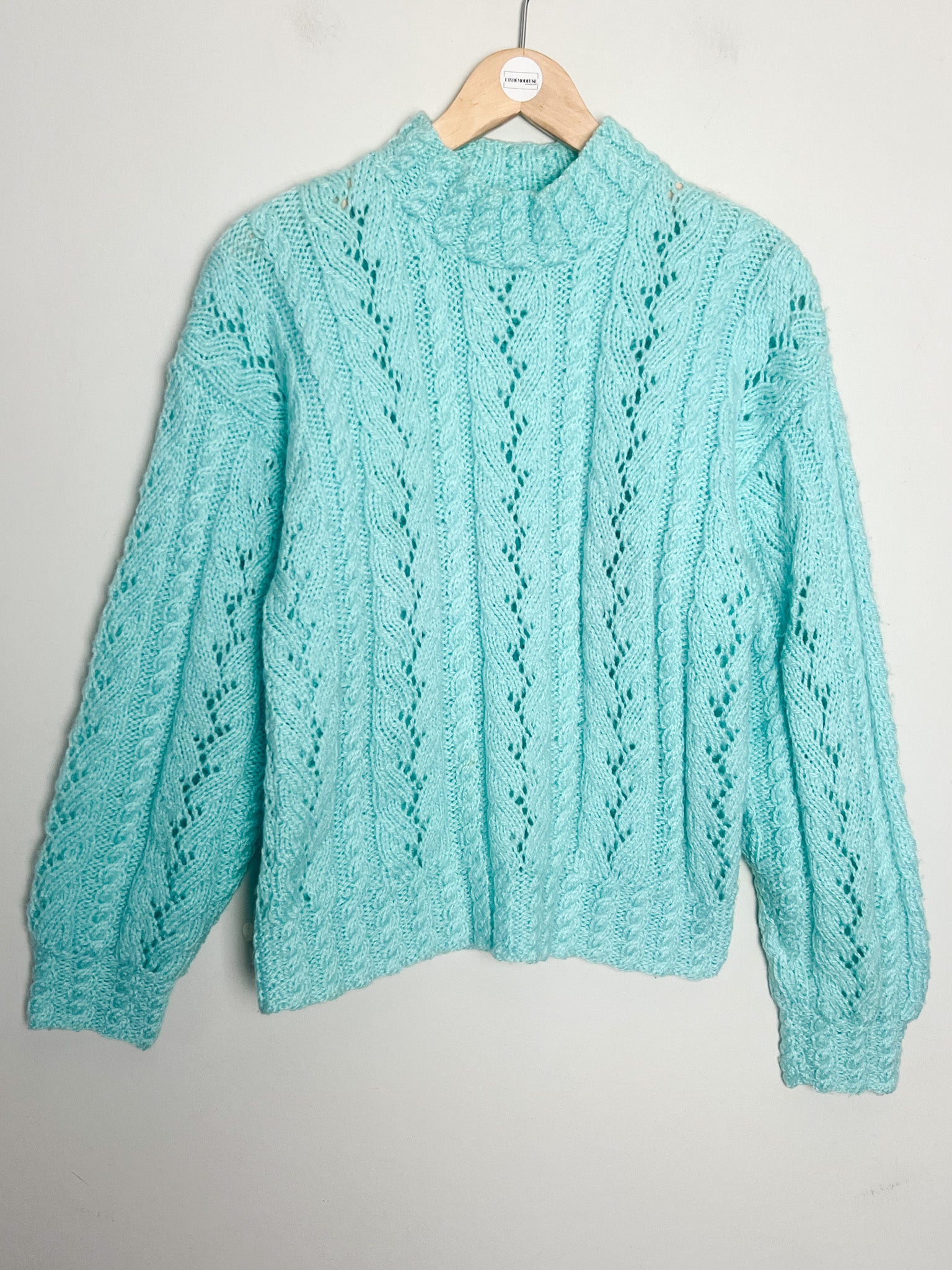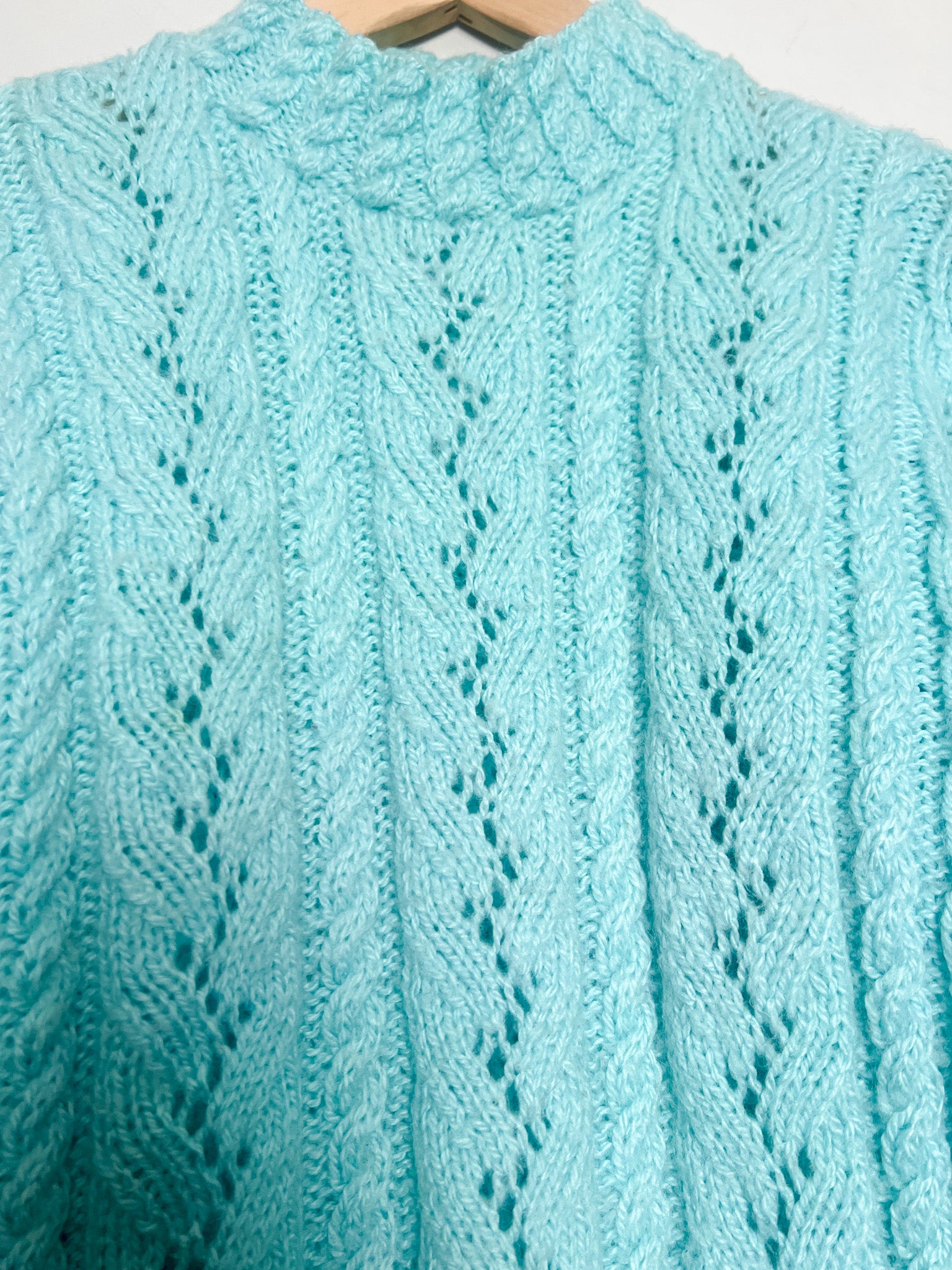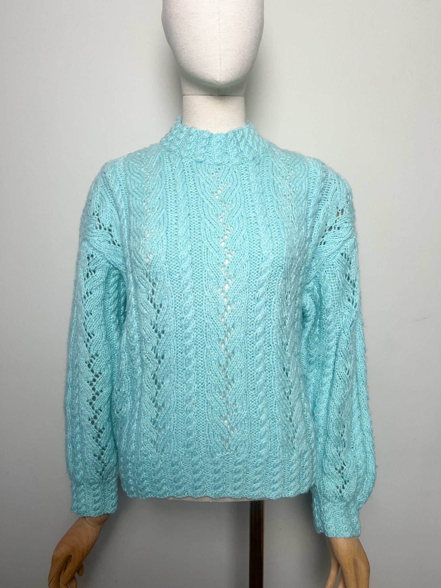 Pull Laine Torsades Vintage (Tricoté Main) - Bleu Turquoise - T. 36/38
