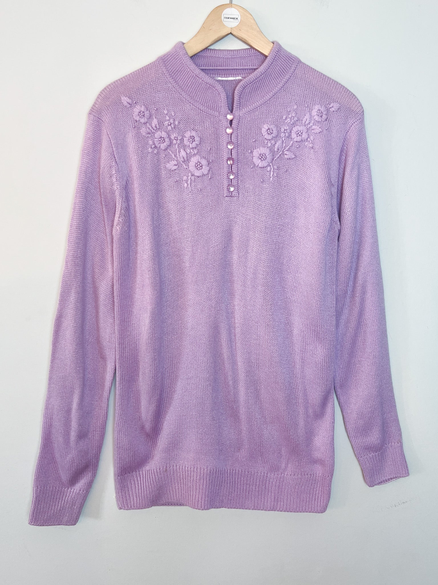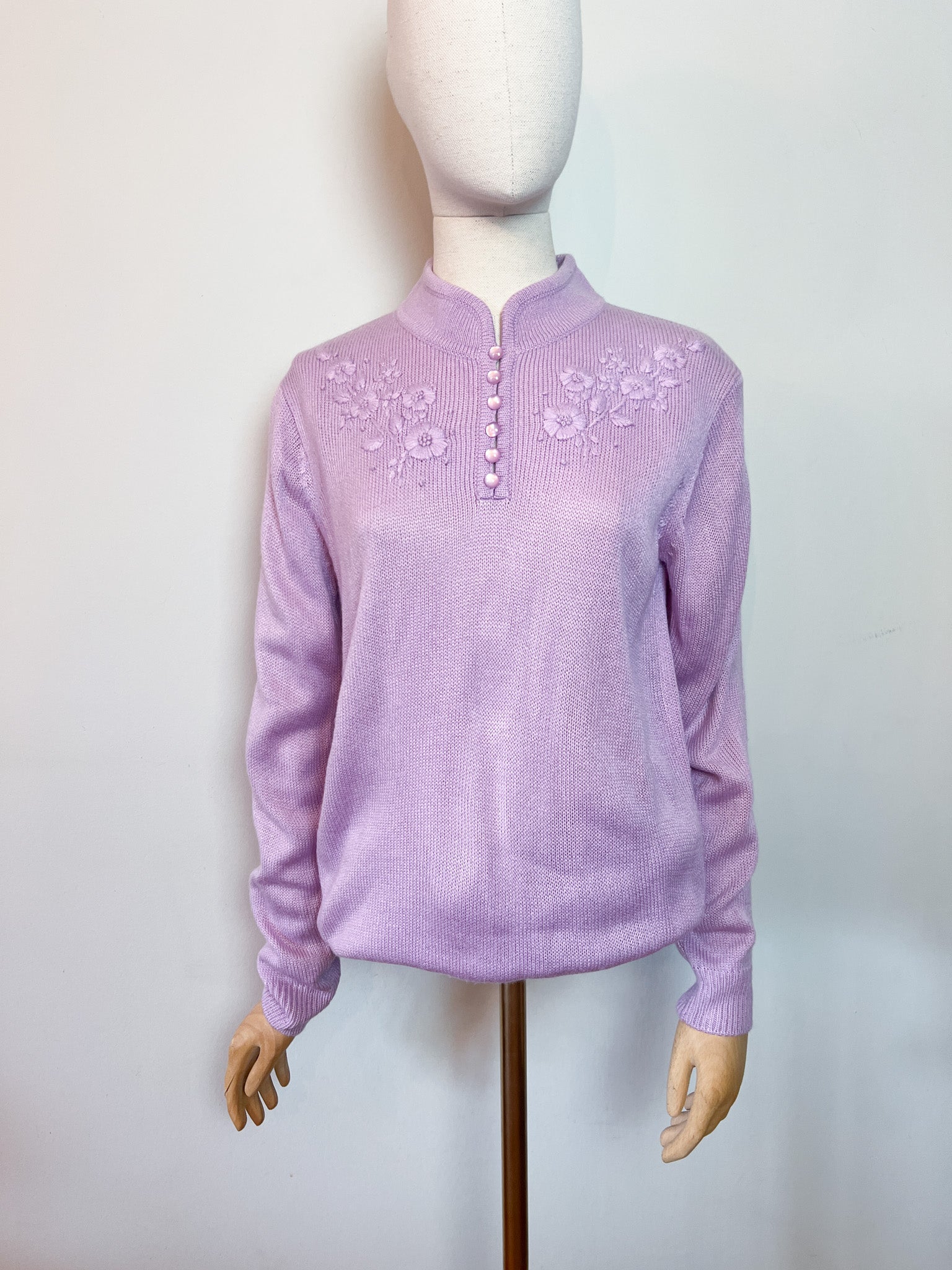 Pull Vintage Col Mao Brodée Lila - Taille 38/40