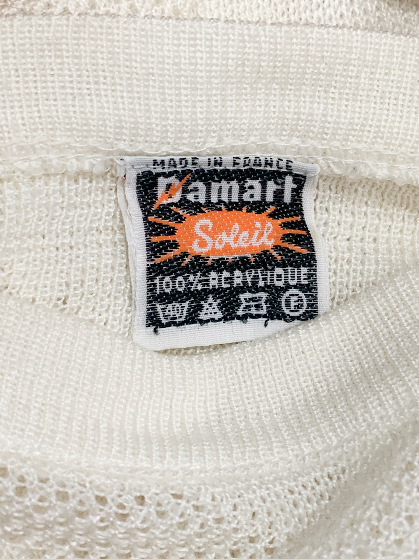 Ce pull vintage Damart de la ligne "Soleil" est un incontournable pour un style léger et aéré. Sa maille ajourée et semi-transparente est idéale pour l'été, pour un look délicat et décontracté. Le col bateau et la coupe ample confèrent une allure bohème-chic à cette pièce. De couleur blanc pur, elle s'associe facilement à toutes vos tenues.