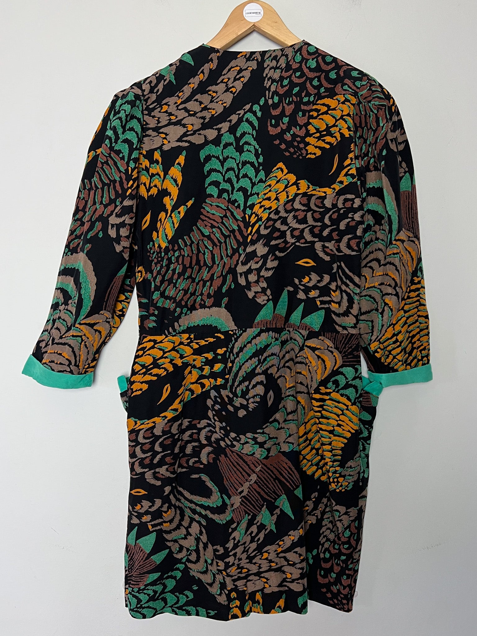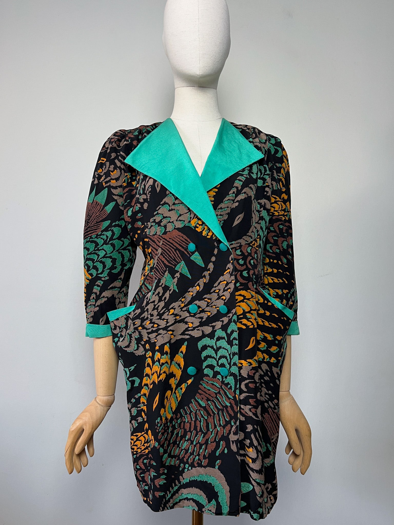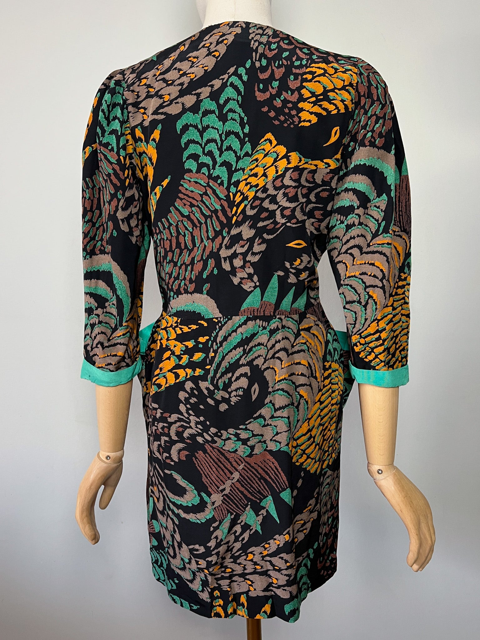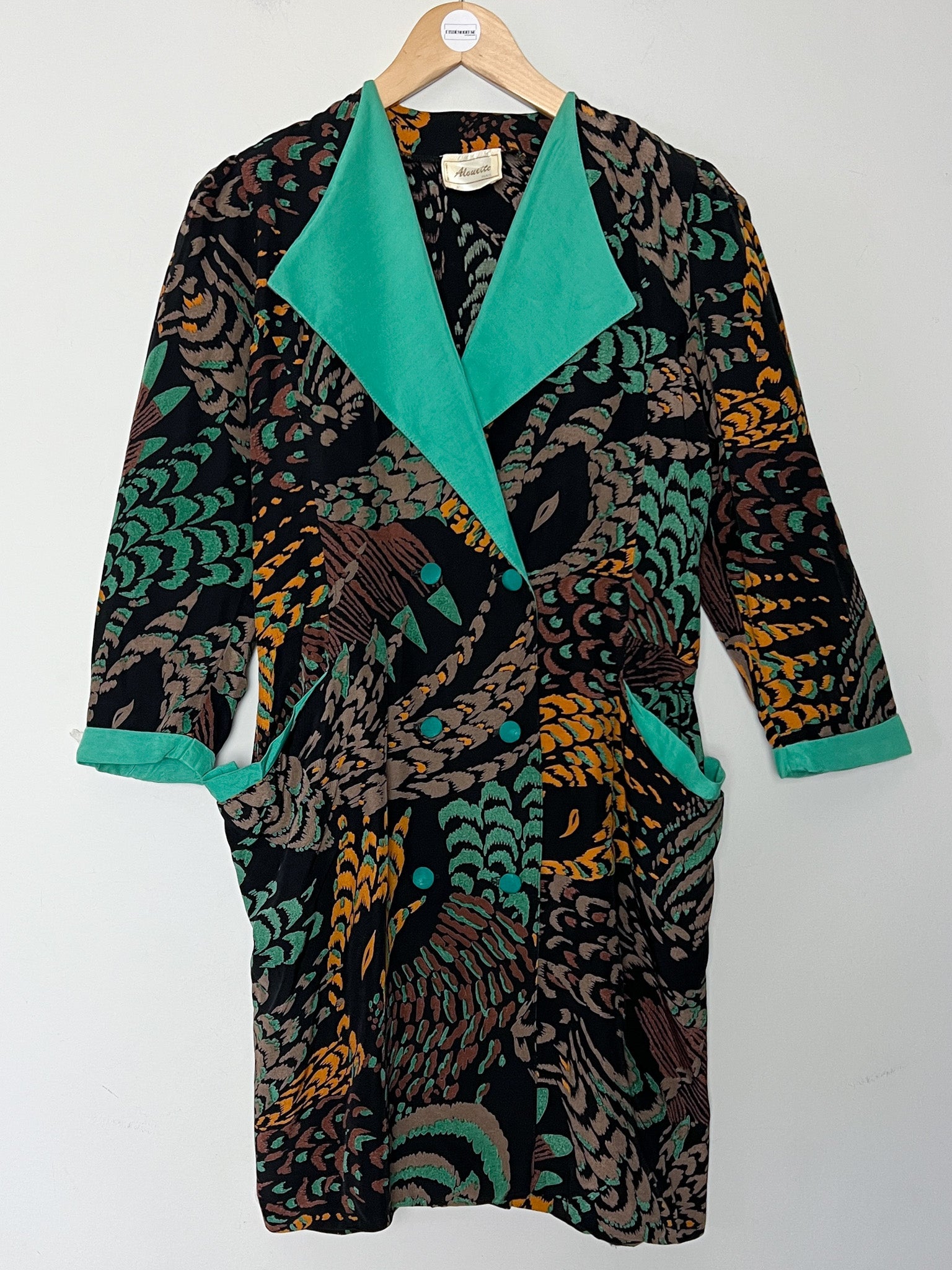 Robe Courte Veste Vintage Alouette Paris - Imprimé Exotique & Col Velours Vert Canard - Taille S (36 FR)