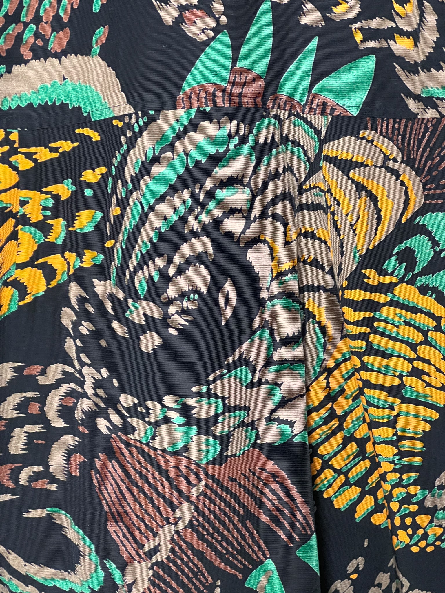 Imprimé Spectaculaire : Le tissu arbore un motif riche et abstrait, évoquant des plumes exotiques ou une flore stylisée d'une jungle luxuriante. Les couleurs se déclinent en un fond noir profond, rehaussé de touches de brun terreux, d'orange rouille et d'un vert émeraude vibrant.