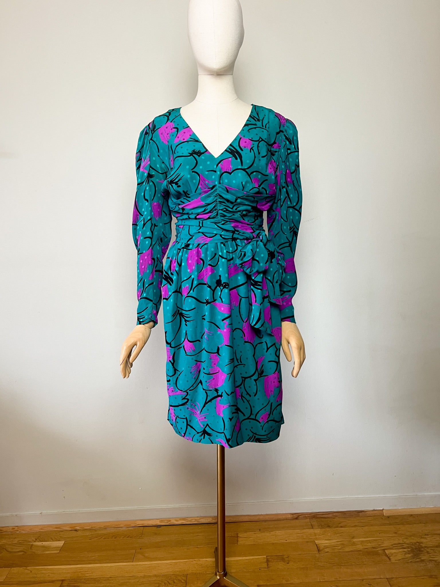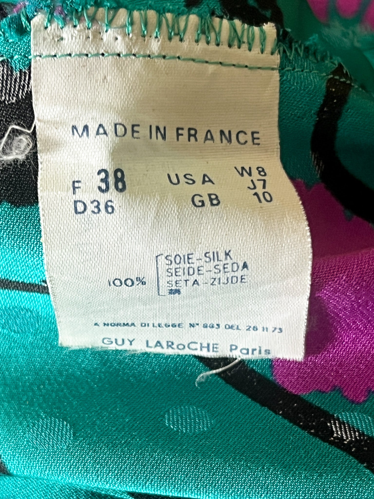 Robe GUY LAROCHE Vintage Luxe 100% Soie - Imprimé Abstrait Vif - Années 80 - Vert Émeraude, Fuchsia, Noir - Taille 38