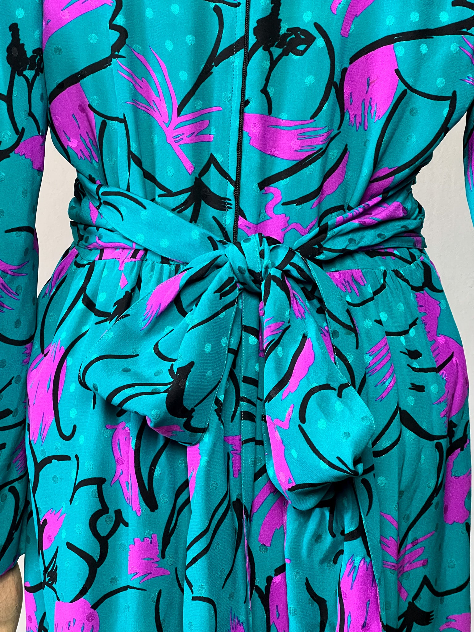 Cette robe incarne parfaitement l'esthétique vibrante de l'époque avec son imprimé abstrait et dynamique mêlant un vert émeraude (ou turquoise) éclatant, un rose fuchsia intense et du noir. Des pois en damassé ton sur ton ajoutent une texture subtile et raffinée à ce tableau graphique.