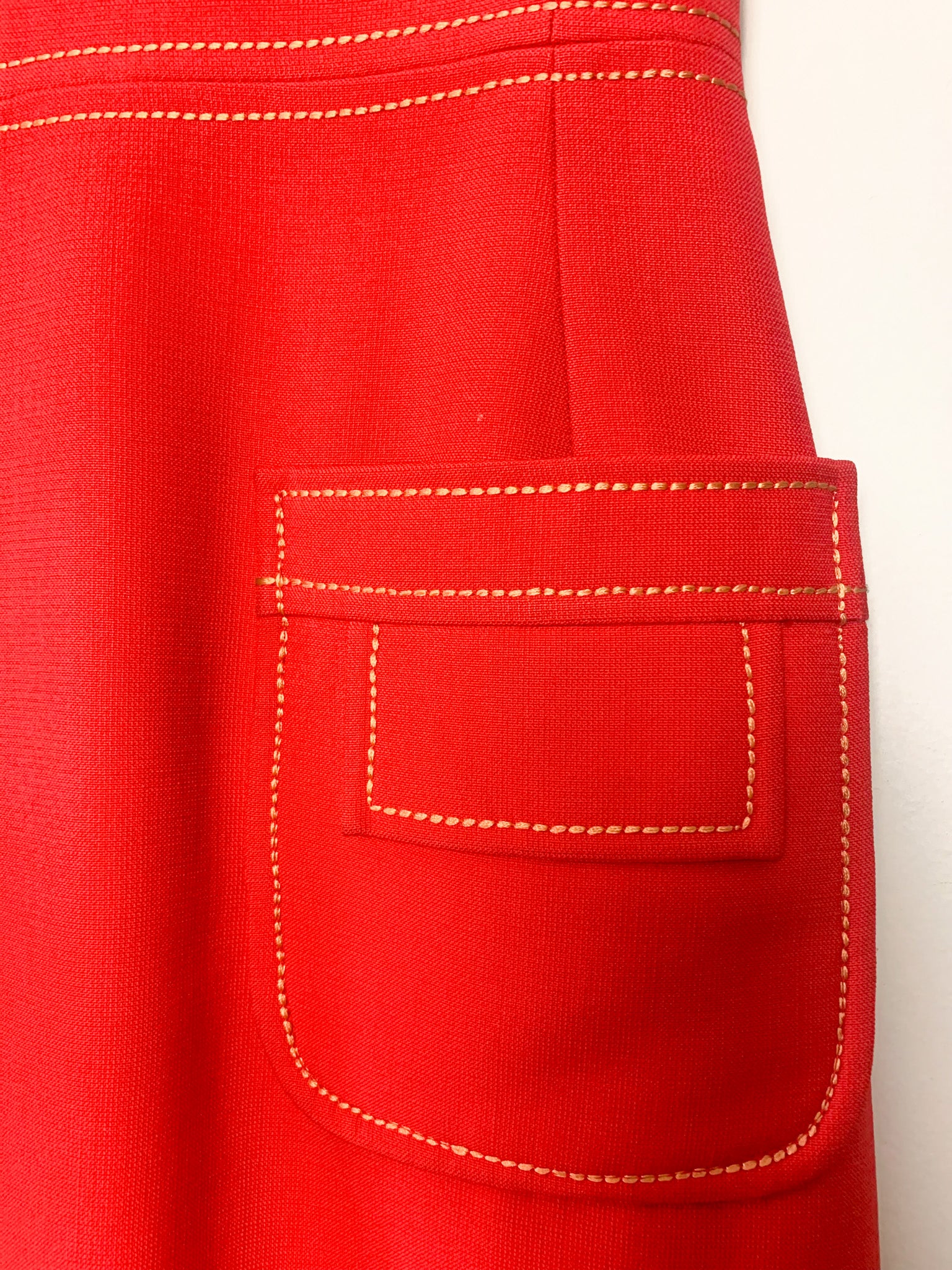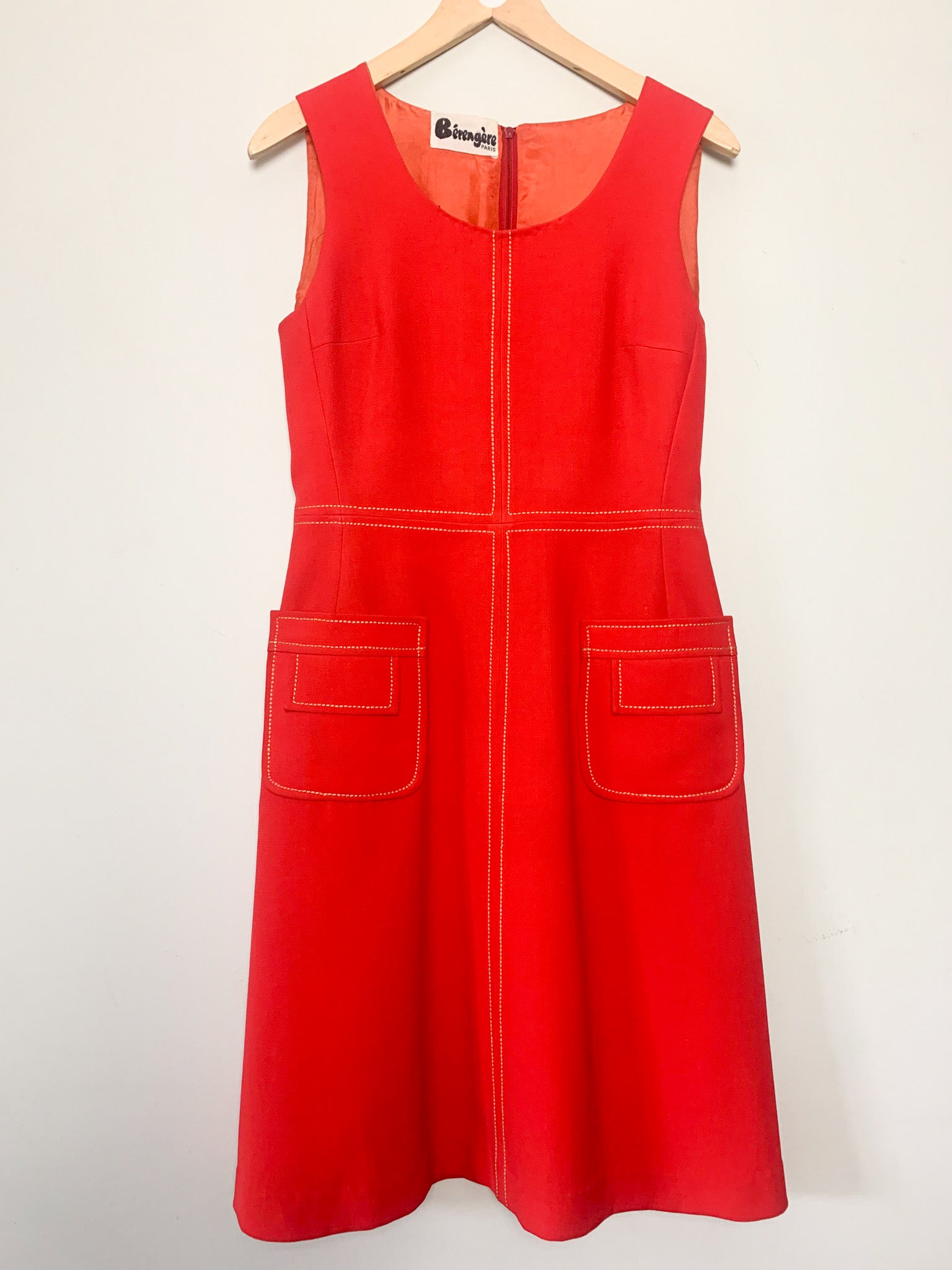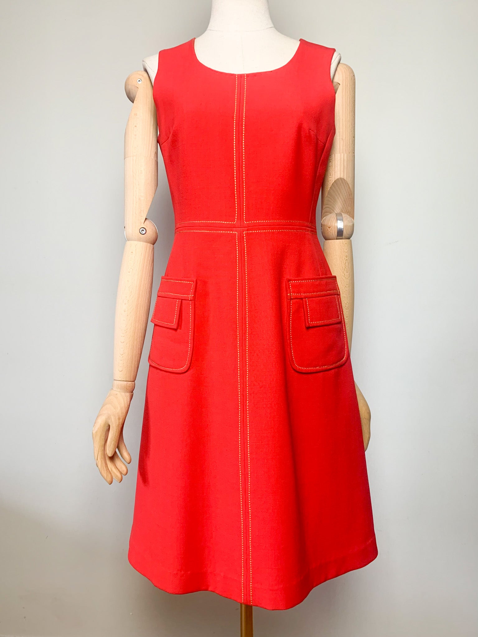 L'élégance minimaliste des années 60 incarnée. Cette robe trapèze est une pièce vintage d'exception. Sa coupe structurée et sa couleur Rouge Vif en font un vêtement intemporel, parfaitement dans l'esprit Mod Chic des designers comme Courrèges.