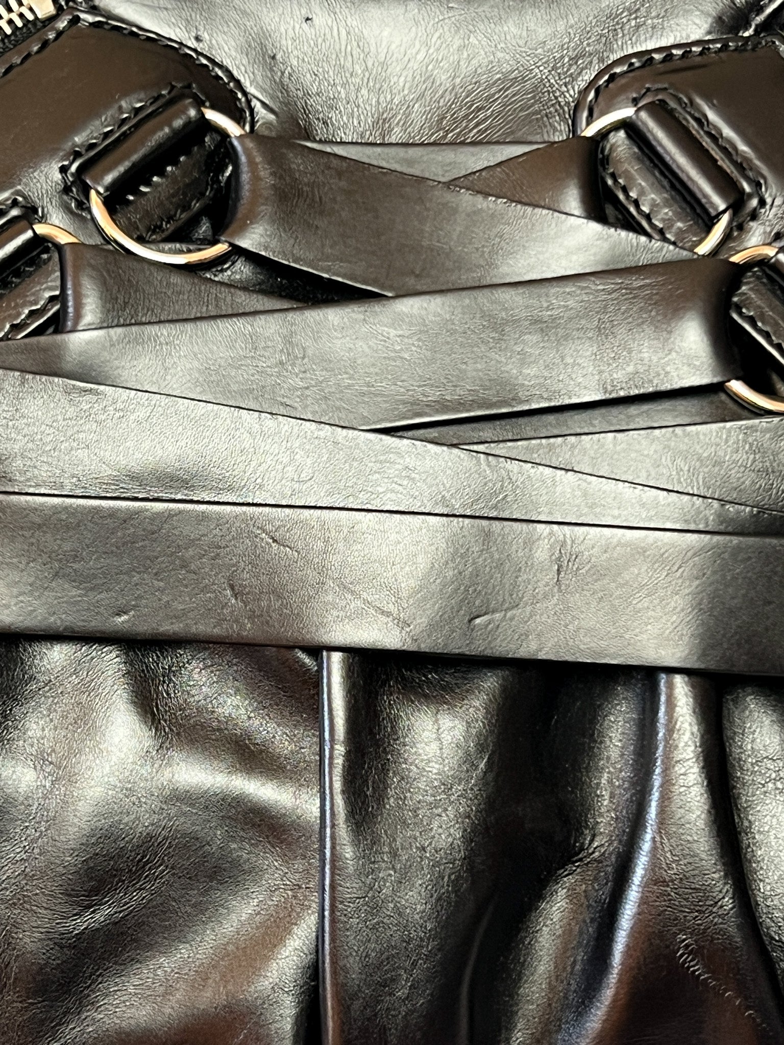 · Son design est dynamisé par de multiples fermetures éclair obliques décoratives, des sangles en cuir et des anneaux métalliques argentés, qui lui confèrent un caractère distinctif et contemporain des années 2000, rappelant les laçages d'un corset.