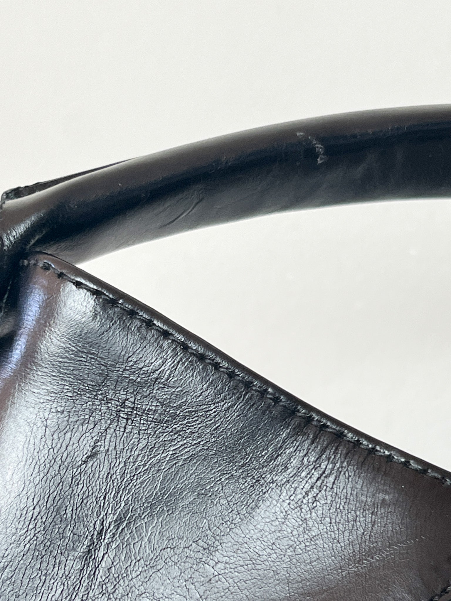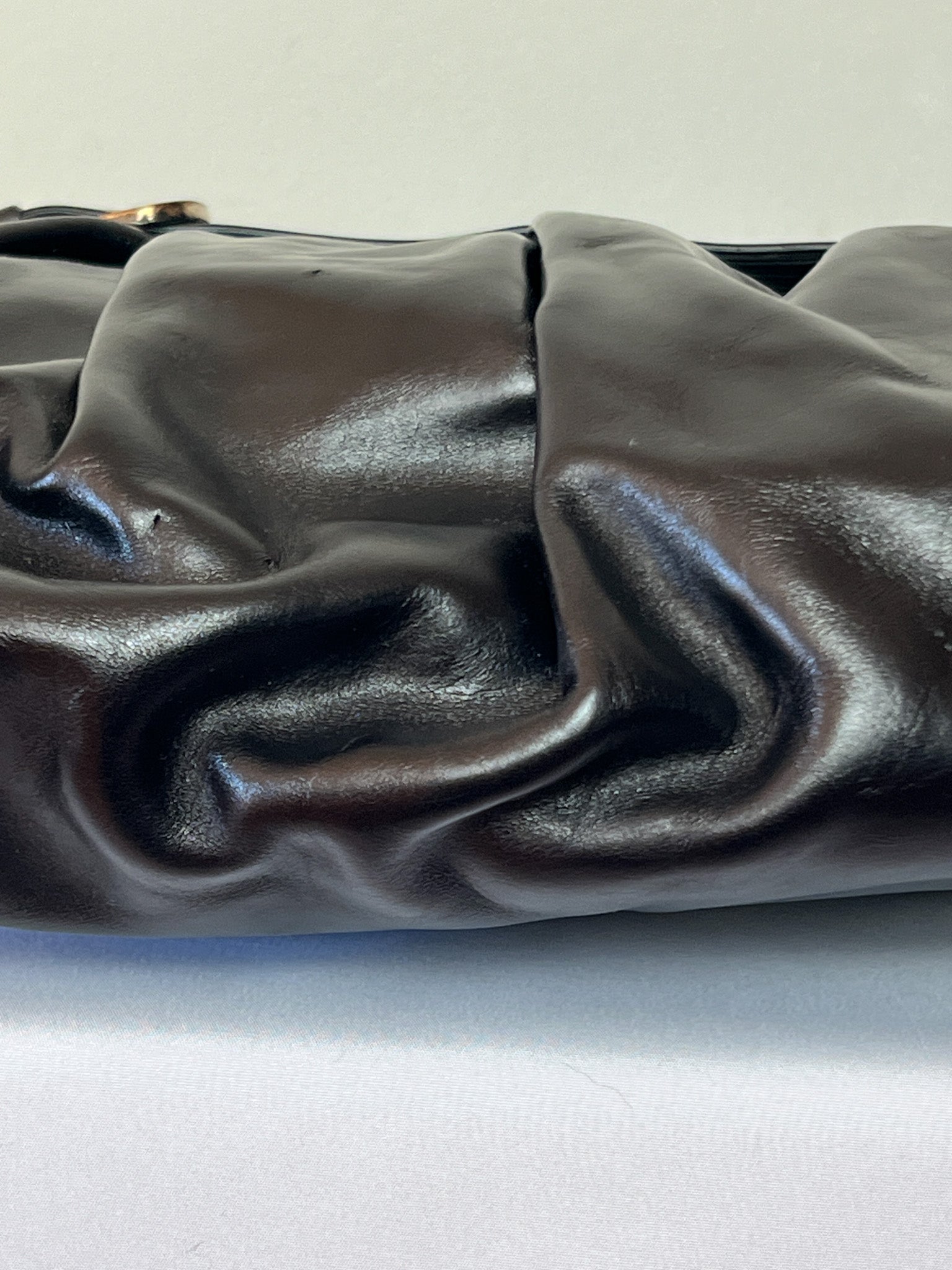 · Confectionné en cuir noir souple, il présente de charmantes fronces sur le bas, ajoutant du volume et de la texture, évoquant un drapé de ballet.