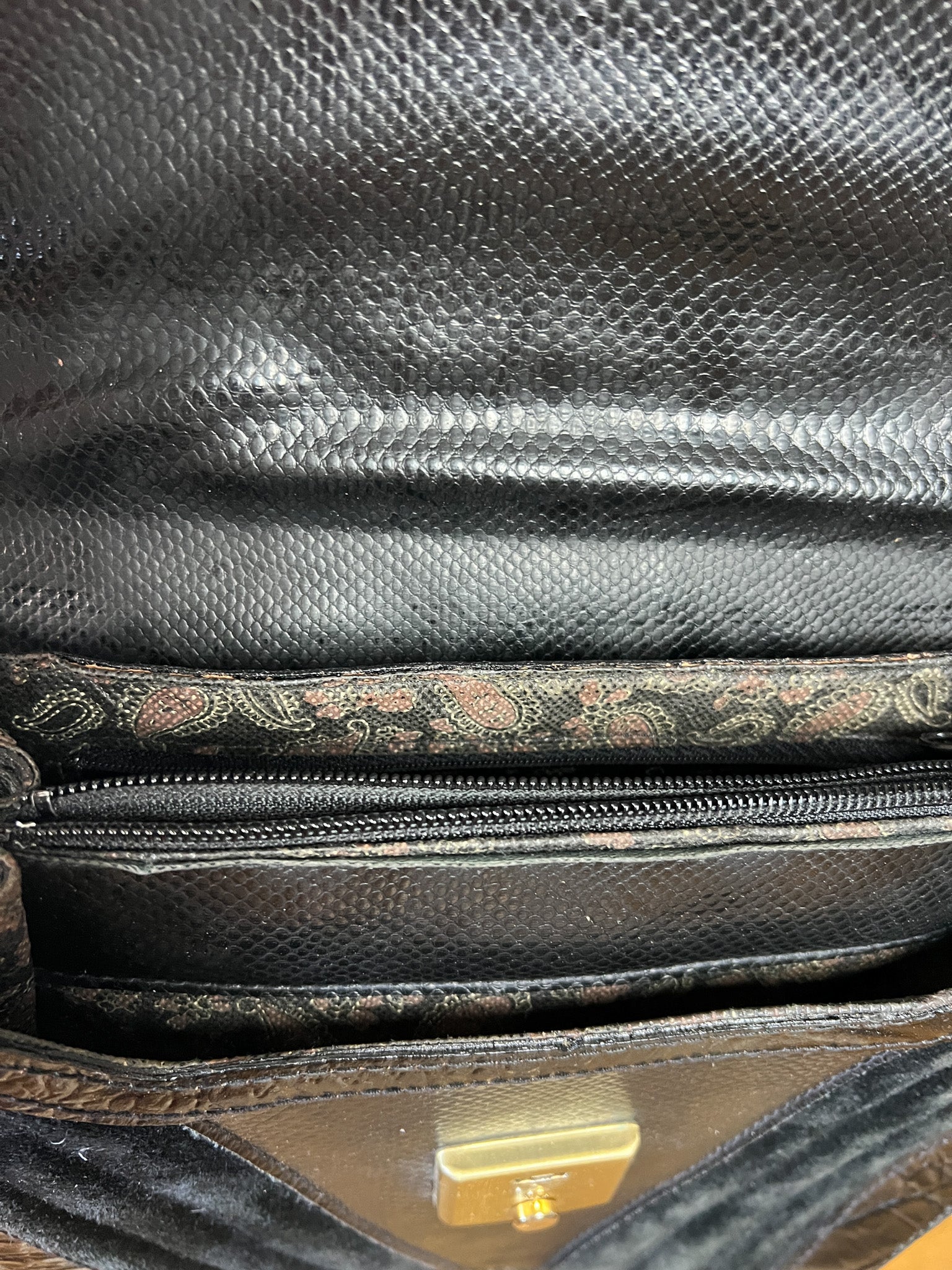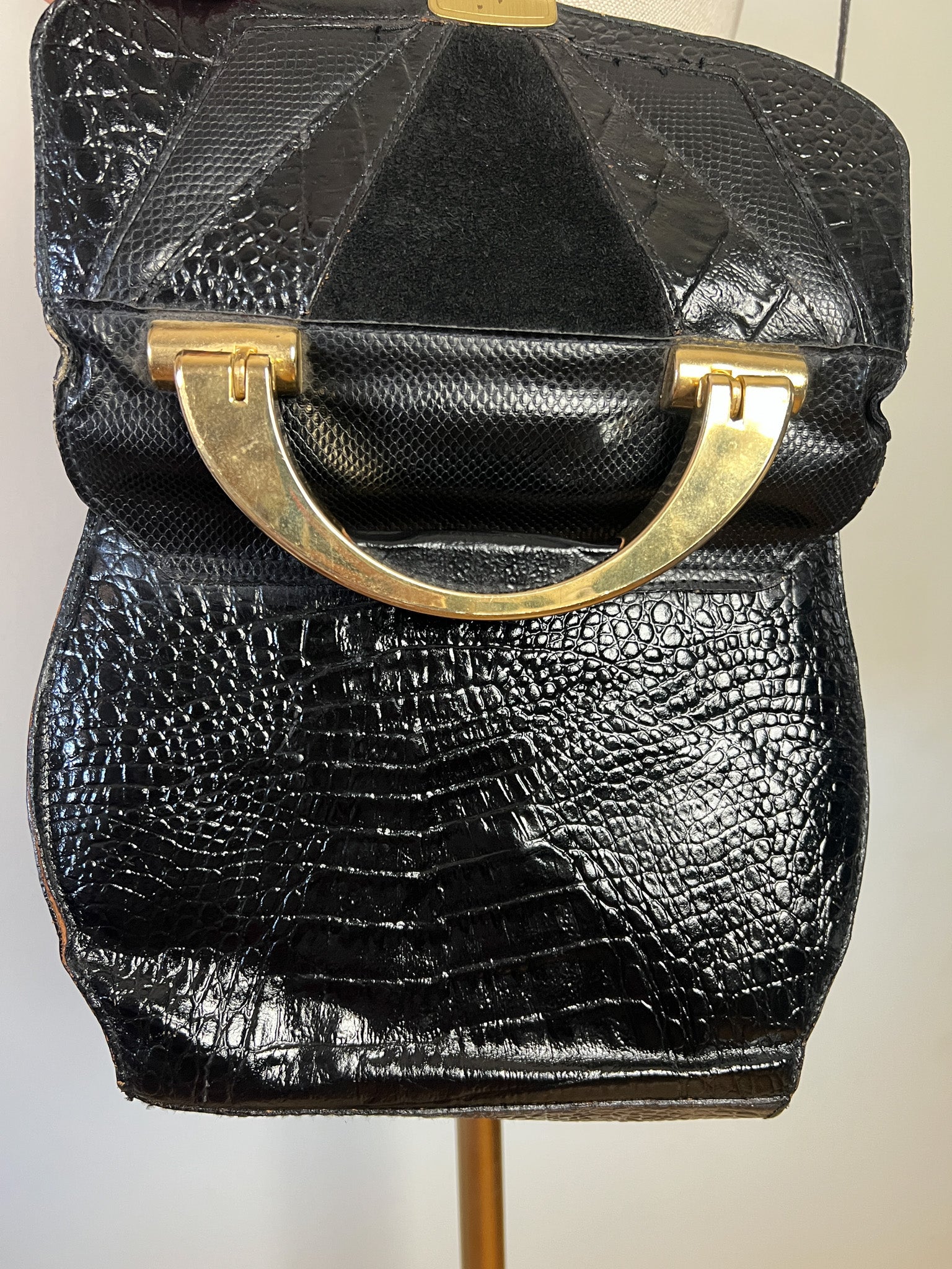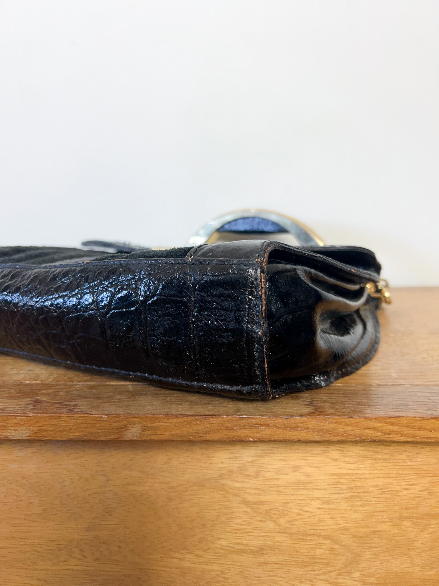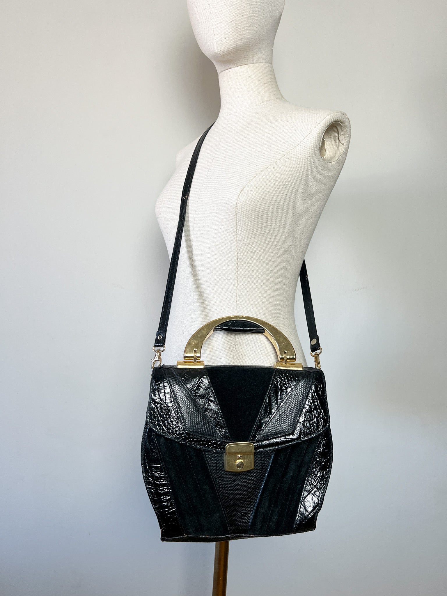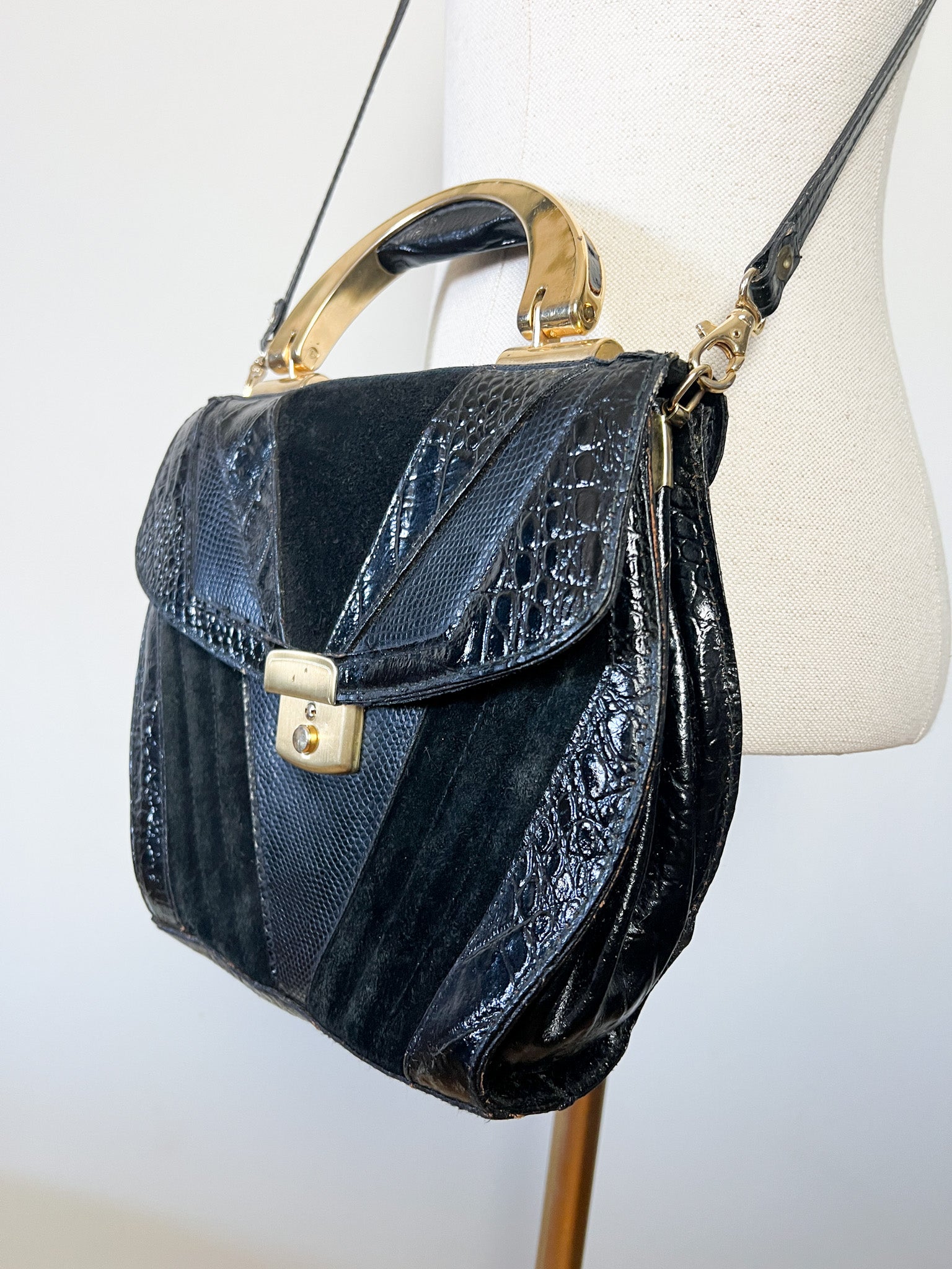 Sac à main Vintage Noir Patchwork Cuir & Daim - Anse Rigide Dorée - Bandoulière Amovible - Années 80 - Rétro Chic