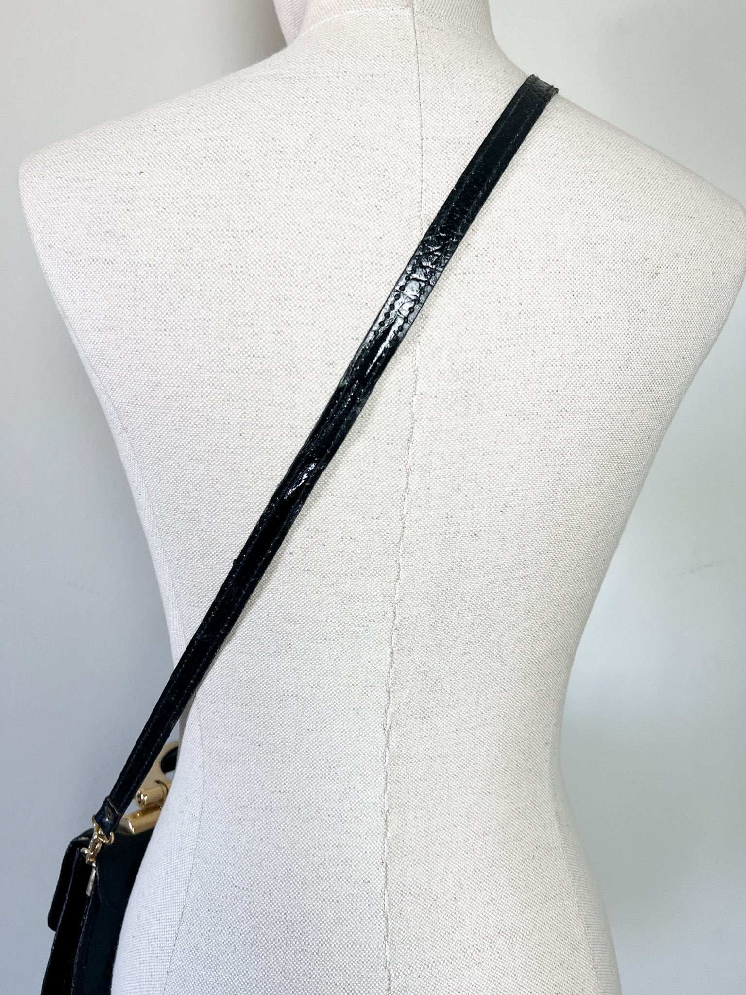 Une bandoulière amovible en cuir noir, permettant un porté épaule ou croisé pour plus de praticité.