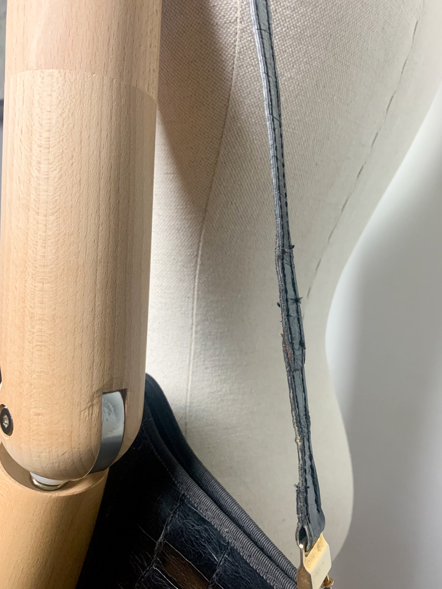 Usure : La bandoulière présente des marques d'usage liées à son âge, qui n'affectent pas la fonctionnalité en mode pochette.